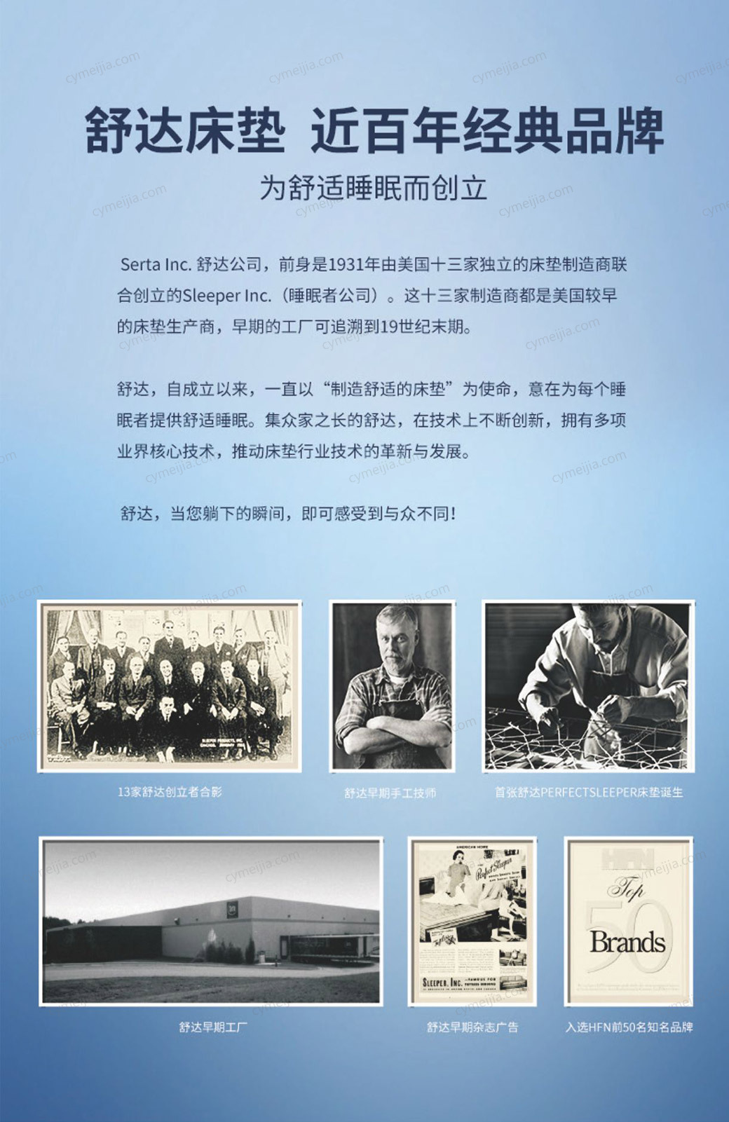 舒达(Serta)床垫,诞生于1931年,是一个全球性专业的健康睡眠品牌,畅销全球约190个国家和地区,92年来始终致力于为全球消费者提供优质健康的睡眠服务,让每个人都能“夜夜好眠”是舒达的愿景。舒达自1998年进入中国以来,坚持并一贯秉承“制造世界上最好的床垫”为使命
