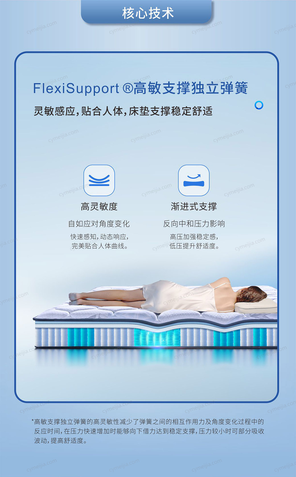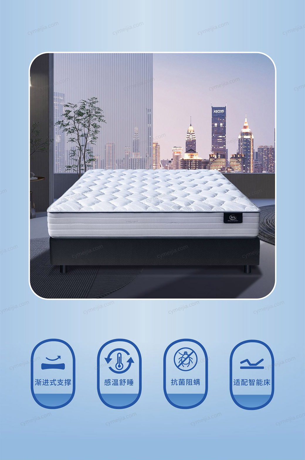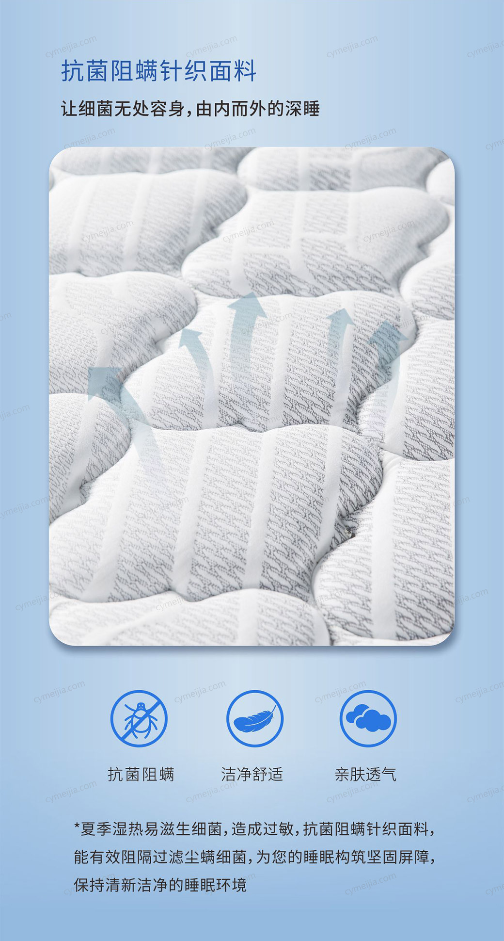 | 产品材质 : | 抗菌阻螨针织面料+恒温凝胶记忆绵+恒温舒适绗缝层+舒柔海绵+优质棉纤维+高敏支撑独立弹簧+单面免翻设计+全向舒适边缘支撑 |