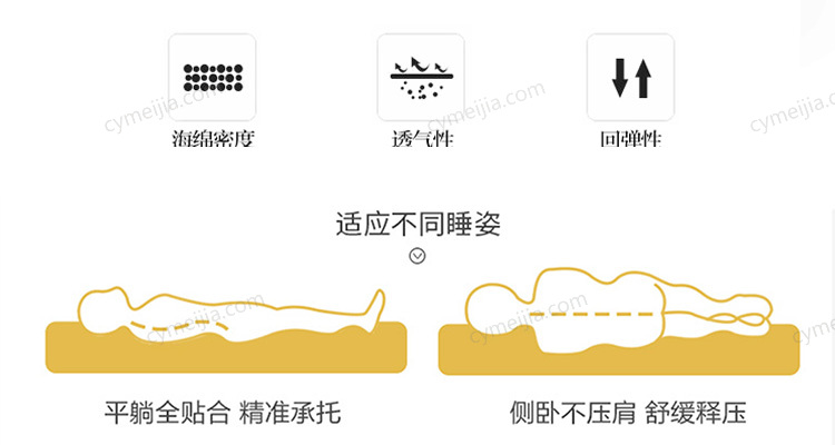 | 软硬度 : 软硬适中 | 填充物 : 乳胶+海绵+纤维棉 | 面料 : 进口针织面料 | |