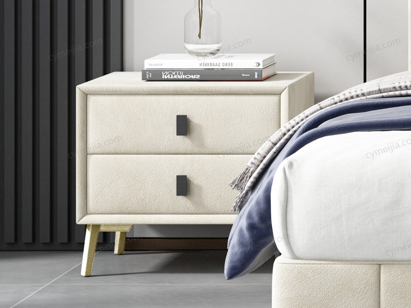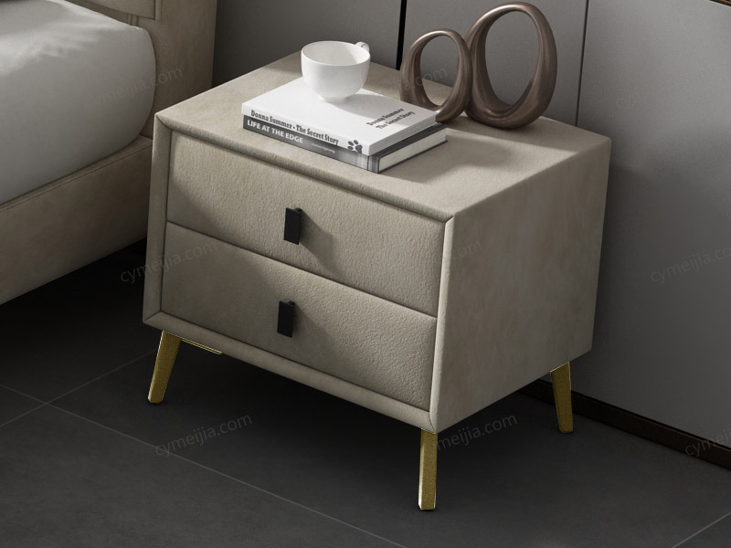 | 产品材质 : | 扪布+实木抽屉+黑磨砂铁五金脚 |
