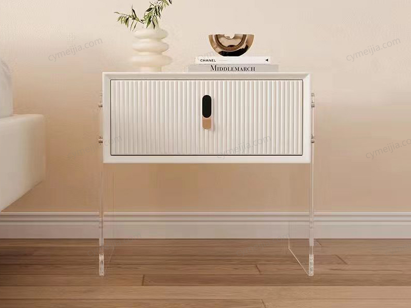 钢琴烤漆面板色泽莹白如玉,兼具耐磨抗刮与防污易洁的特性。搭配高韧性亚克力柜脚,在视觉上营造出通透的悬浮感。整体造型简约时尚,既确保了结构稳固,又为现代卧室注入一抹轻盈灵动的艺术气息。