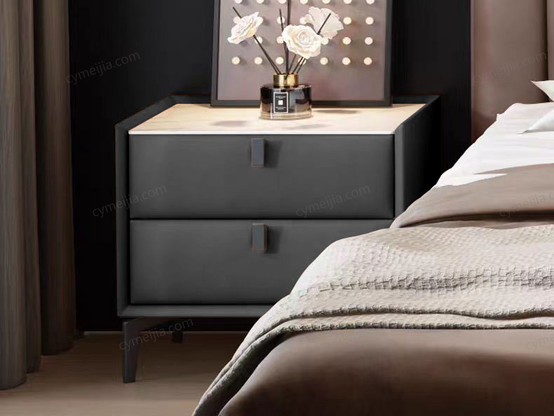 | 产品材质 : | 扪皮+全实木柜体+实木抽屉+岩板台面+碳素钢脚 |