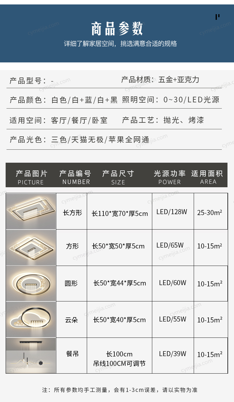 | 灯体尺寸 : | 50*44*5(圆),50*50*5,110*70*5,100*100*8cm |
