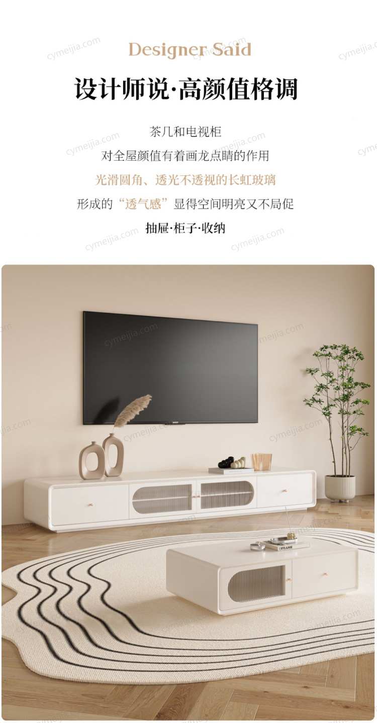 | 产品材质 : | 钢琴烤漆工艺+实木抽屉+缓冲轨道+长虹玻璃柜门 |