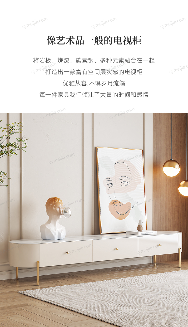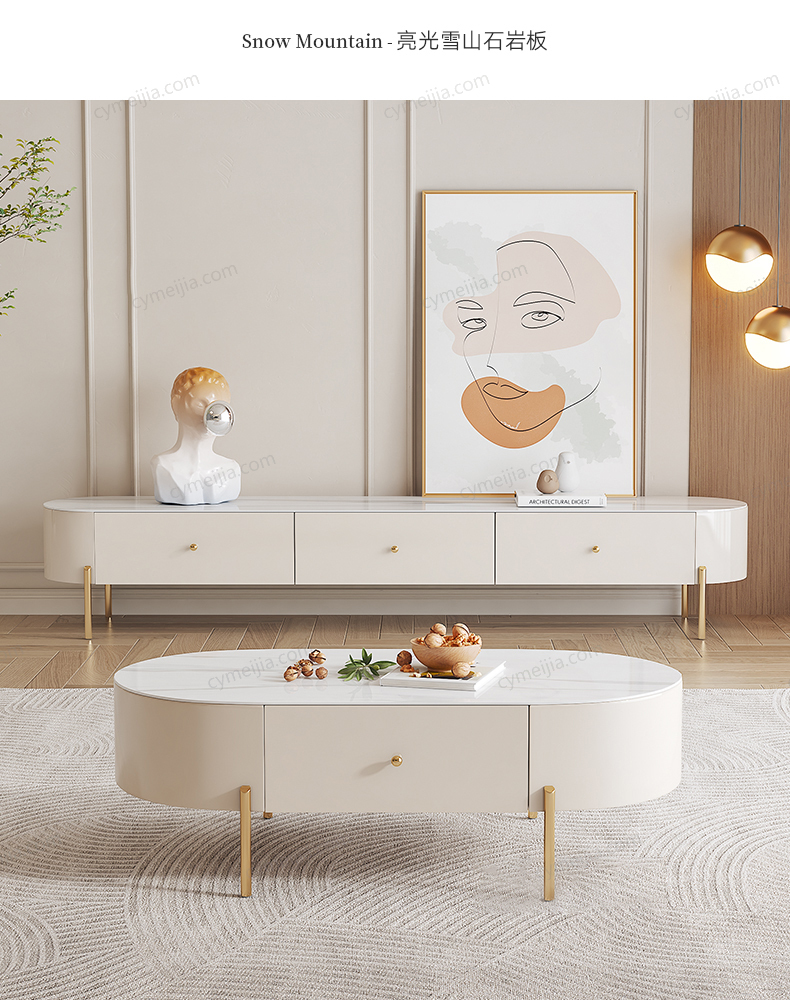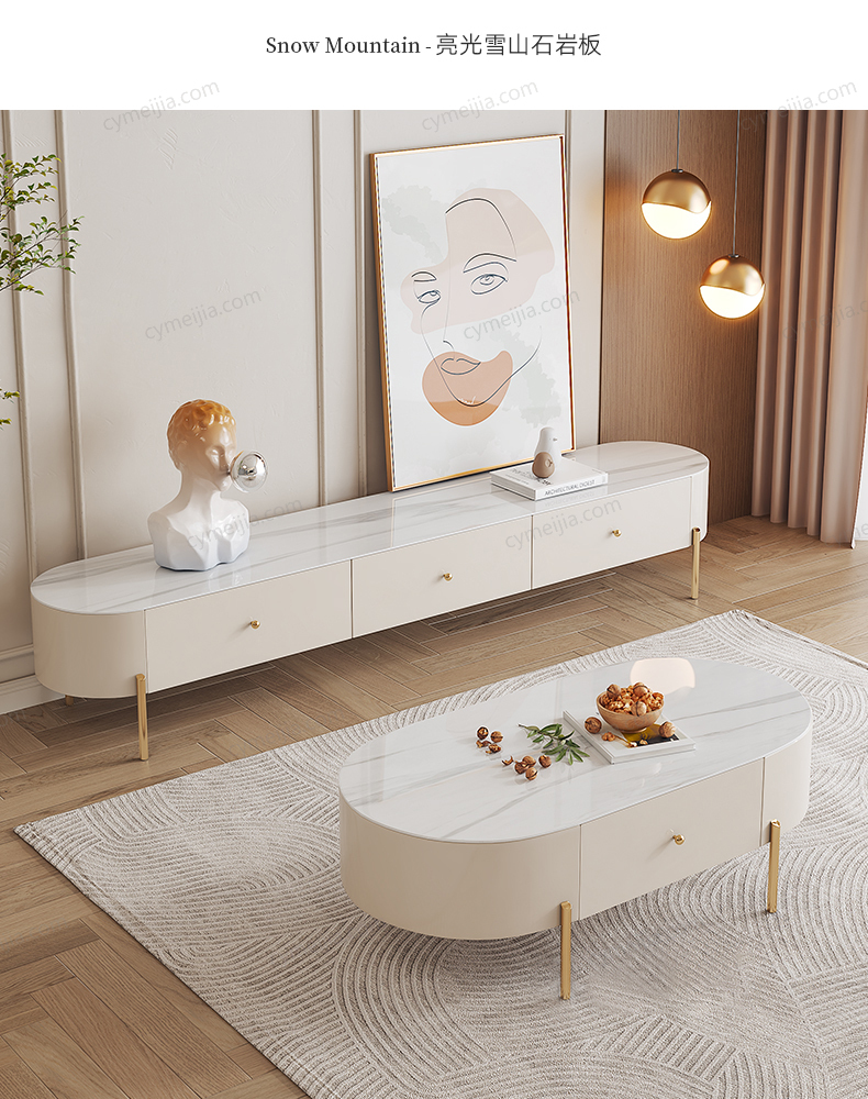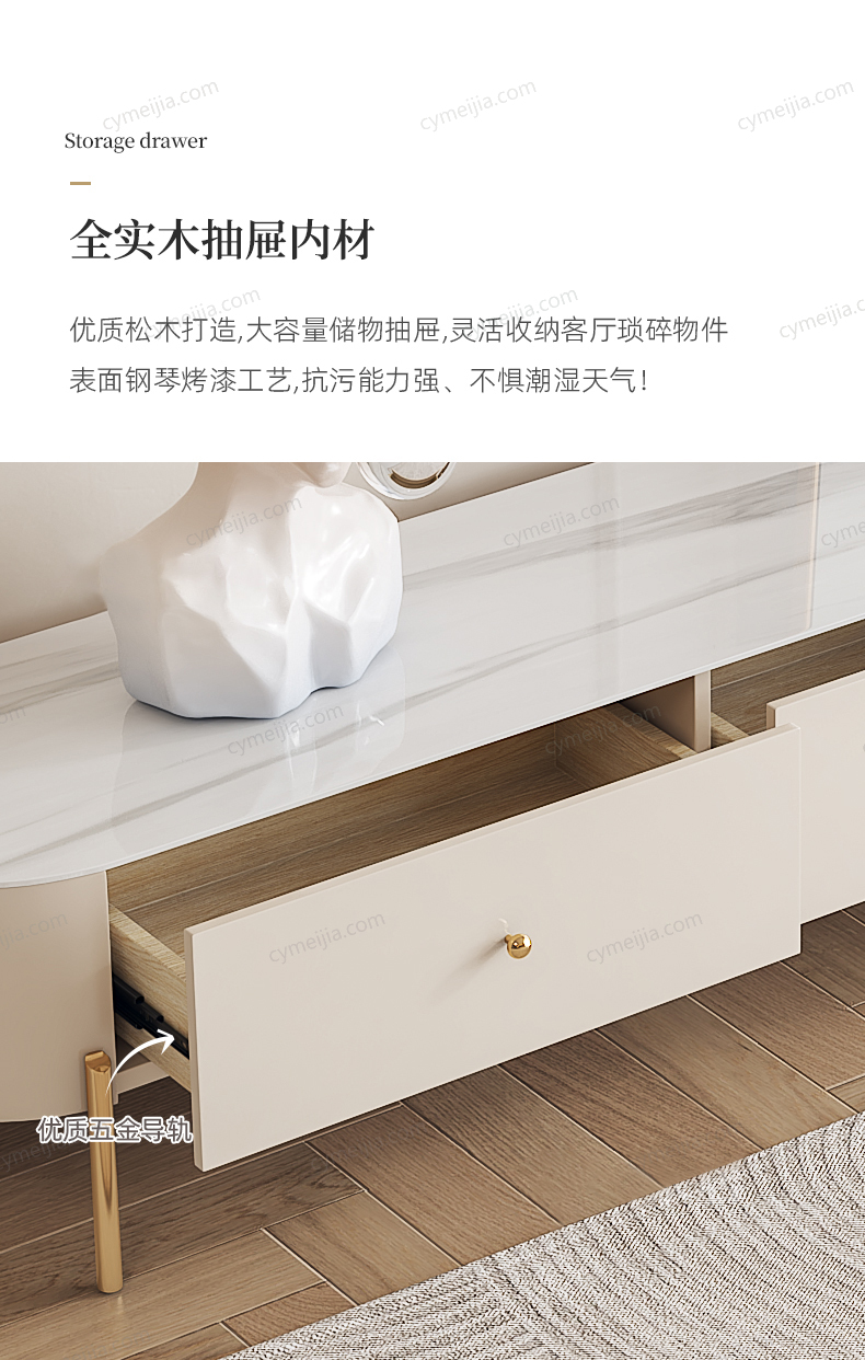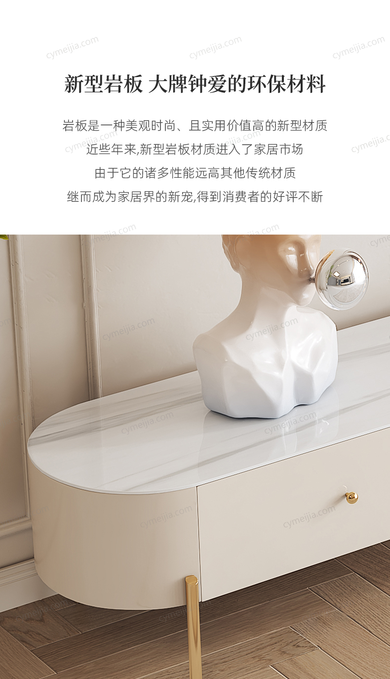 | 产品材质 : | 亮光雪山石岩板+实木抽屉 +中纤板+15cm铁镀钛金脚 |