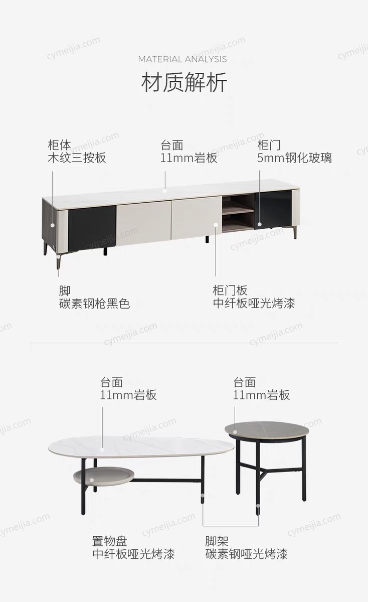 | 产品材质 : | 11mm加厚岩石板+多层板木+钢化玻璃+碳素钢脚 |