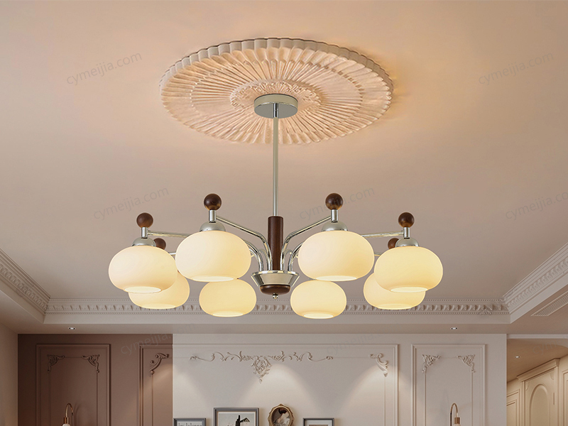 | 产品材质 : 实木+铁艺+玻璃 | 产地 : 中山 | 光源类型 : E14*8 | |