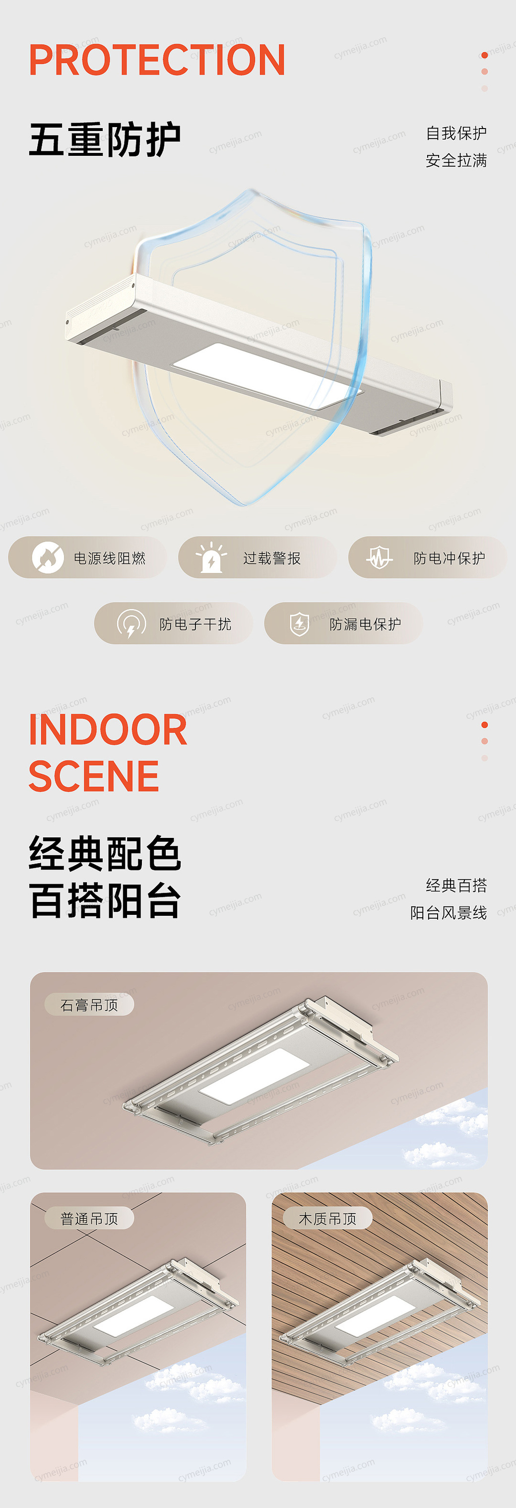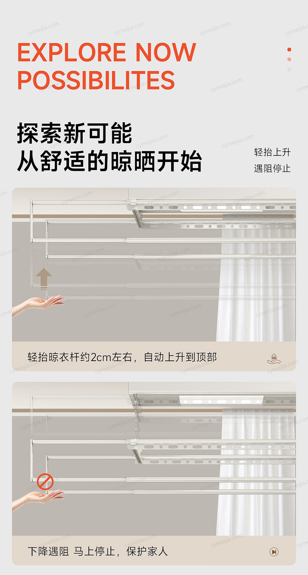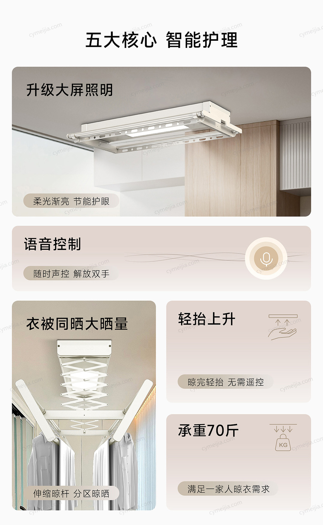| 产品功能 : | 大屏照明、静音电机+伸缩四杆、晾杆感应+记忆高度、轻抬上升+语音遥控 |