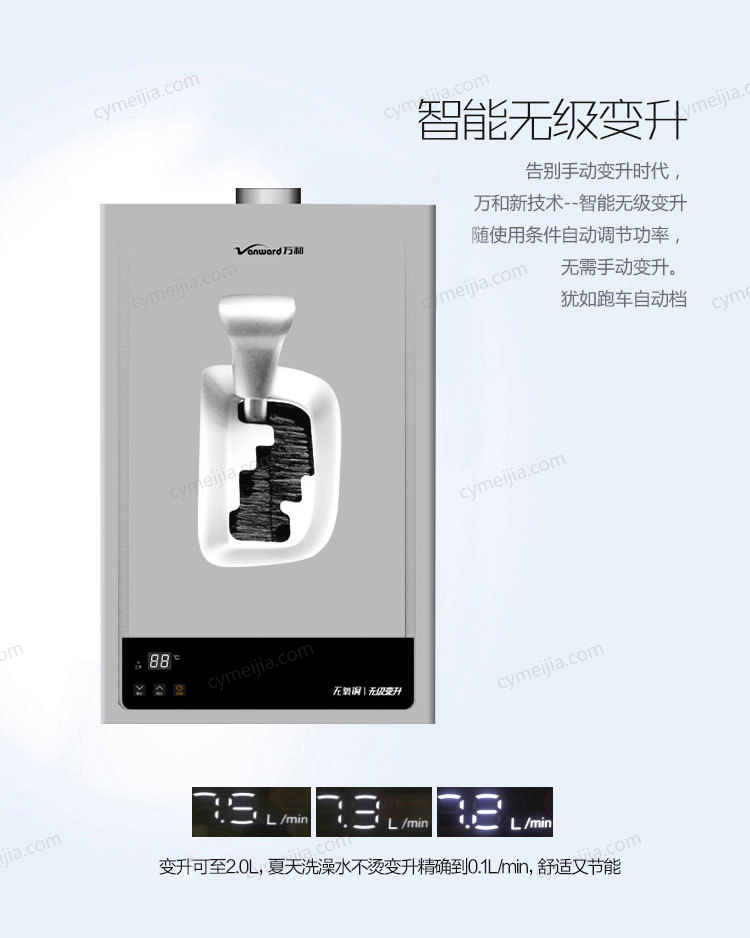| 产品功能 : | 1)数码温度显示,轻触式电子按键;2)微电脑自动记忆上次使用温度;3)六项高效节能技术,节能效果始终如一;4)智能无级变升,随心所浴;5)高效无氧铜水箱,水质健康无忧;6)多重安全保护系统、智能氧护系统、安全防护系统 |