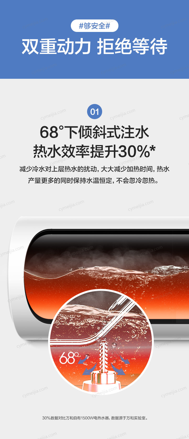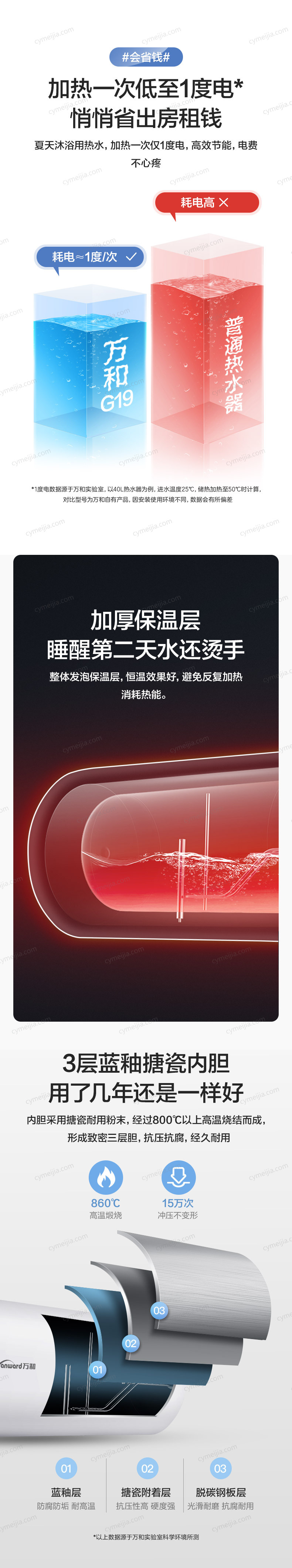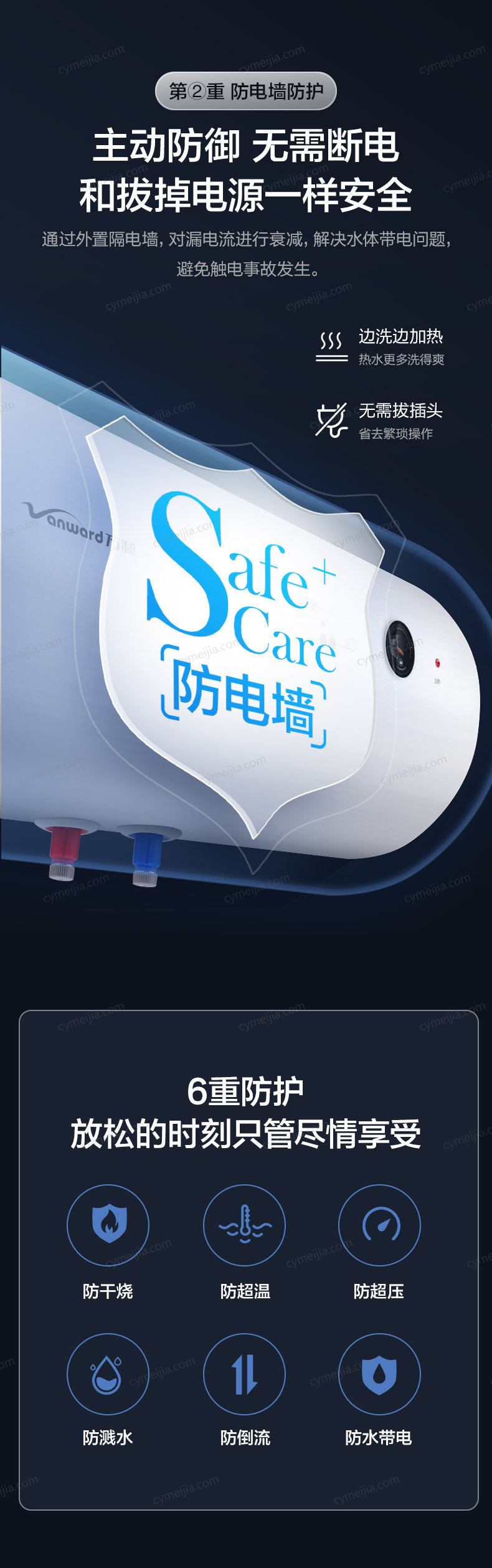 | 产品功能 : | 1)万和双盾安全防护系统,防漏电、防触电;2)万和潜心研制的310S速热发热管,针对中国水质,用电环境及家庭频繁使用等情况,内外兼修,强化加热;3)万和低位层流混合技术,使冷水有序进入,不扰流,不影响顶层热水;4)集合万和电热水器的五大性能超强内胆,保用八年,电阻镁棒,终身免更换,超厚保温聚能发泡层等;5)超温保护、防干烧保护、强弱电分离保护等安全保护;6)智能控制,72小时断电记忆,杀菌抑菌功能;6倍增容功能、省电浴功能(省电40%);7)智能热水量提醒,用水一目了然;8)蓝金刚三层内胆,抗腐蚀、抗水压;9)创新节能保温技术,产品能效等级为:2级 |