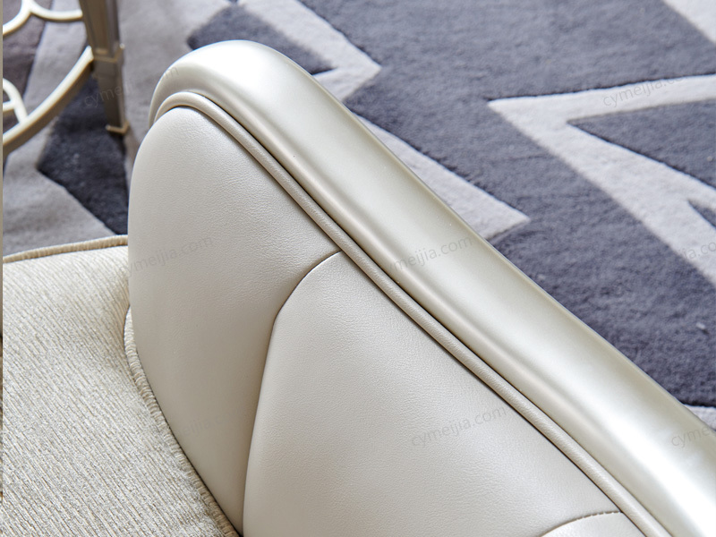 | 产品材质 : | 欧洲进口榉木框架+接触面进口头层黄牛皮靠背+雪尼尔布艺坐垫 |