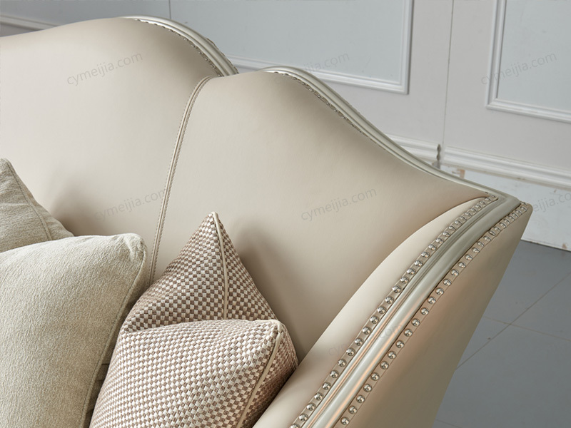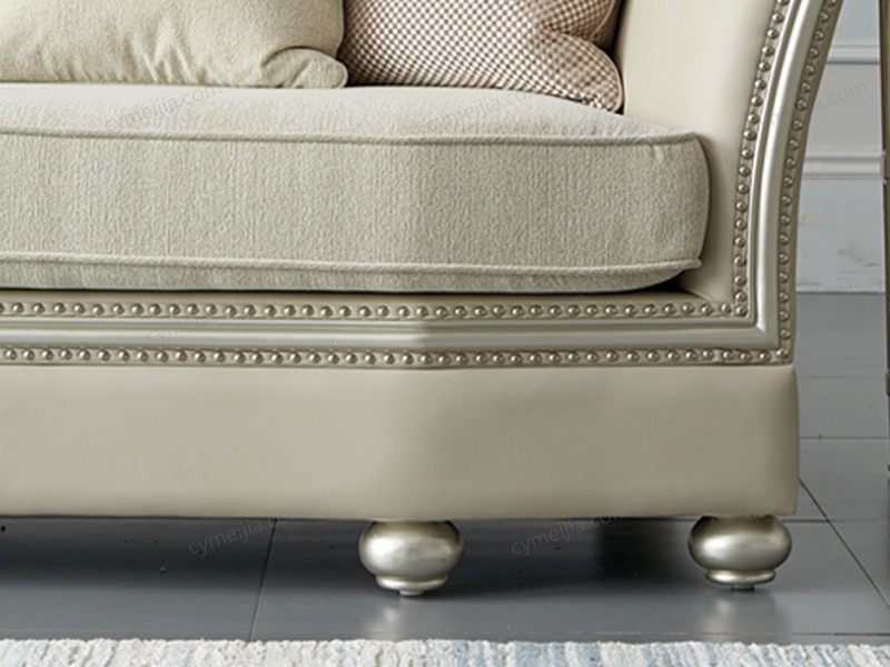 | 产品材质 : | 欧洲进口榉木框架+接触面进口头层黄牛皮靠背+雪尼尔布艺坐垫 |