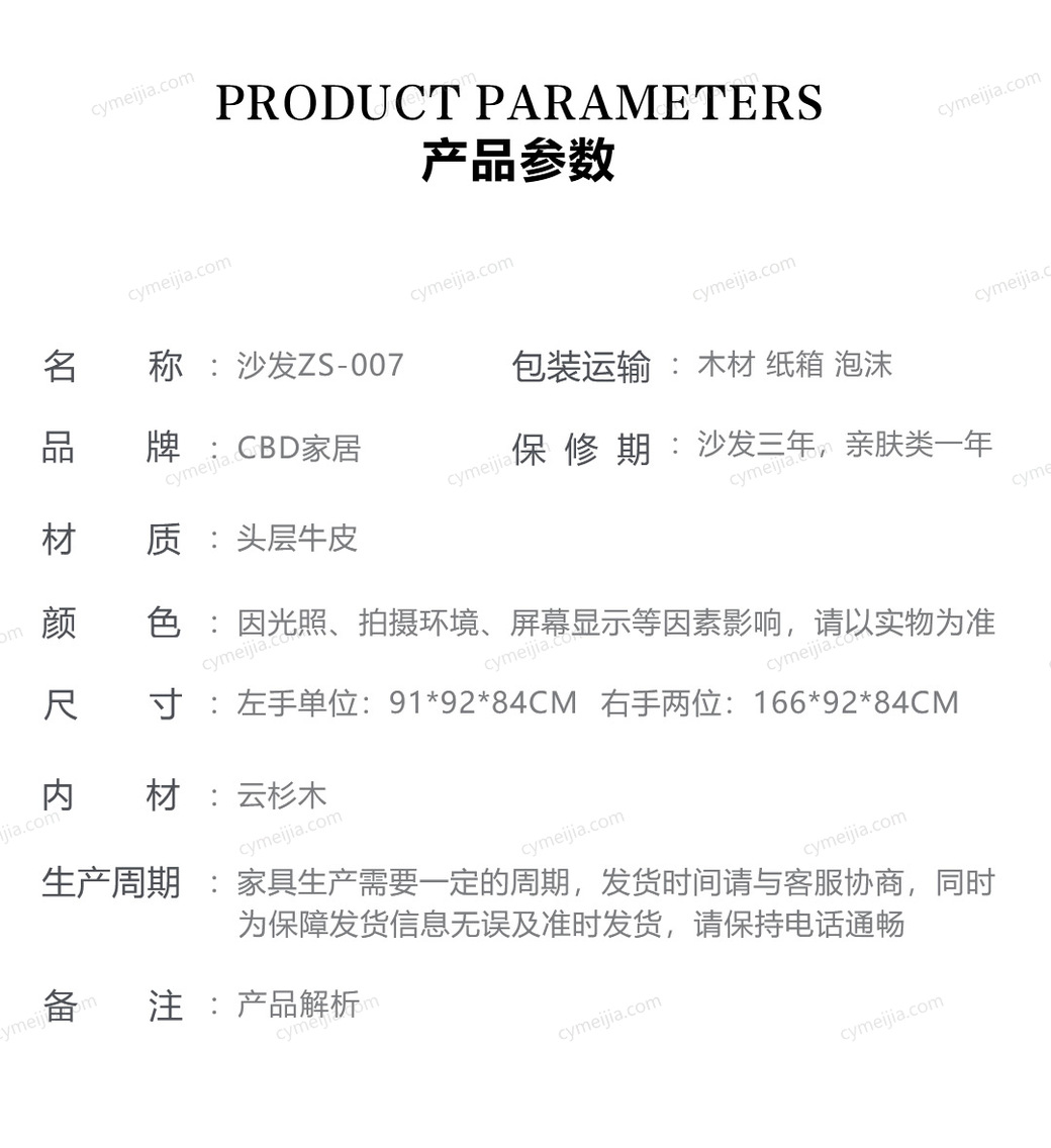 | 品牌 : CBD | 型号 : CBD-ZS-007-ZP-1+3+YGF-ZHSF | 产品材质 : 接触面进口头层黄牛皮+进口云杉木框架+高回弹海绵 | |
