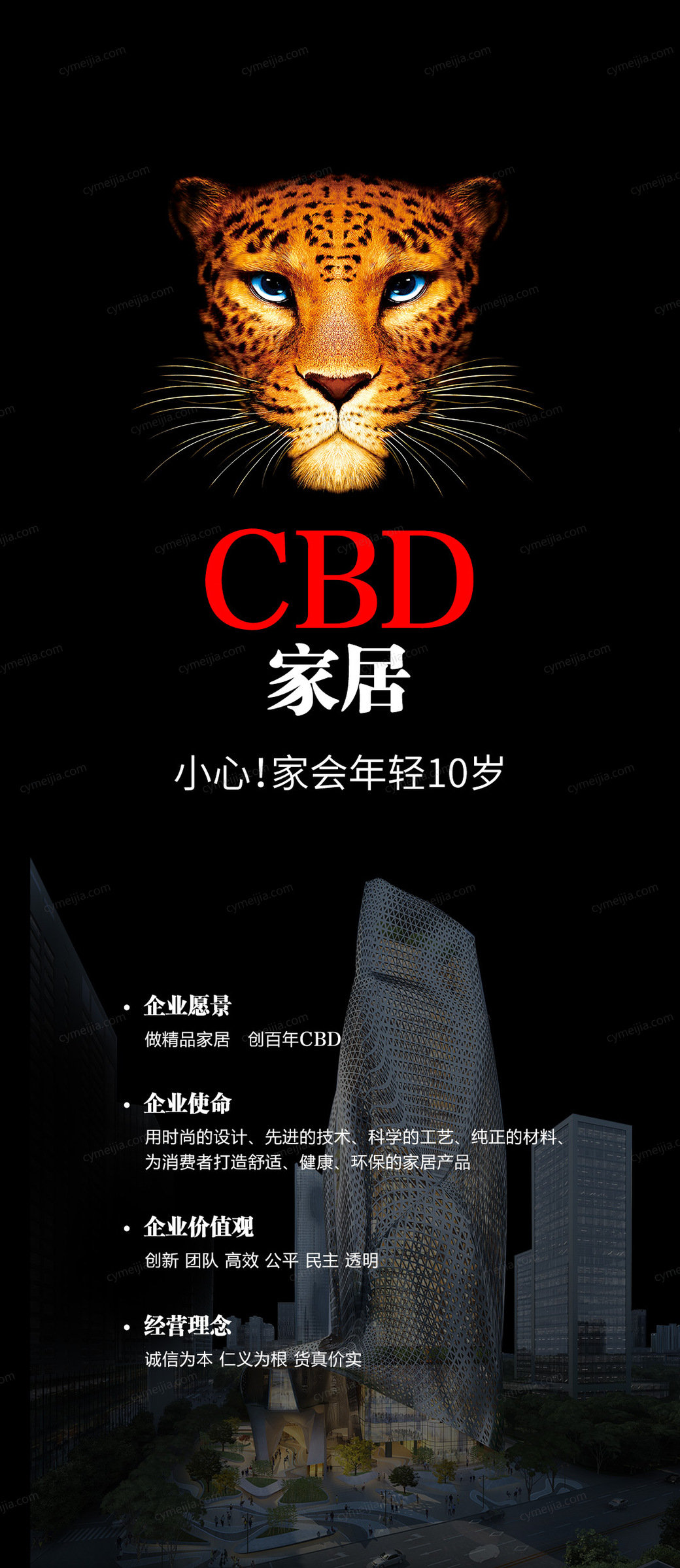 CBD家居秉承为生活而设计的理念,依托自然环保的原材、与时俱新的设计,为消费者打造健康舒适的家,也圆梦消费者对向往生活的追求 CBD家居的slogan—— “小心!家会年轻十岁”同样彰显了CBD家居做精品家居的初心: 打造年轻化的家,给人年轻化的心态。