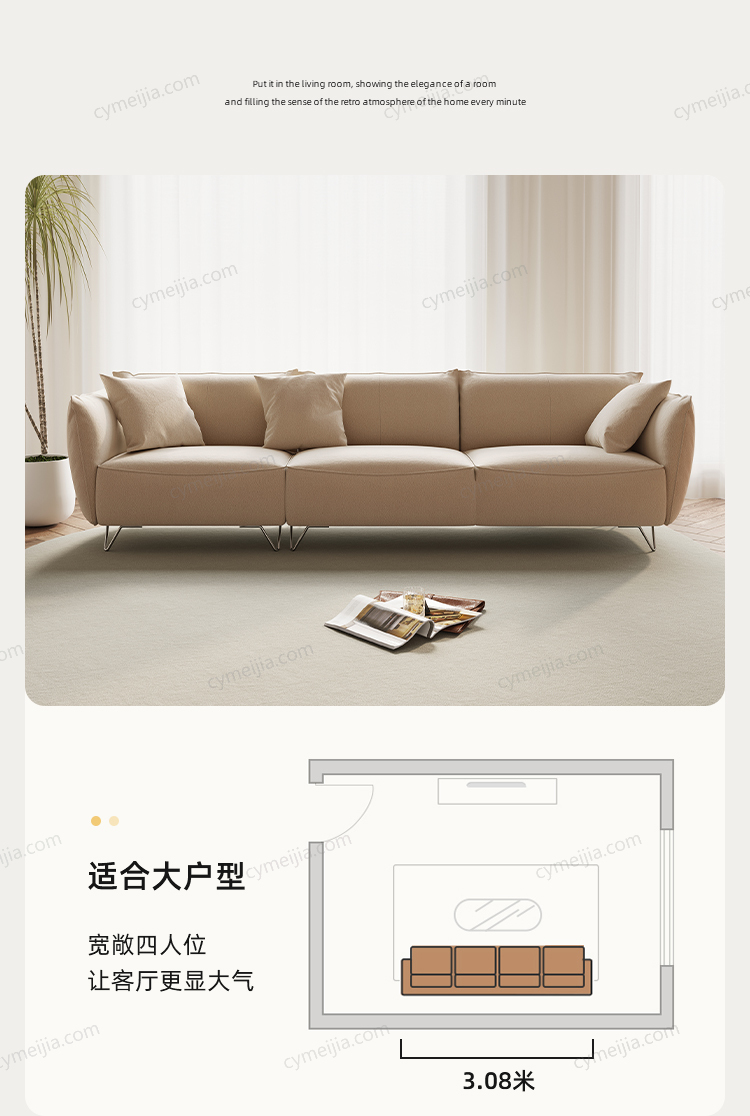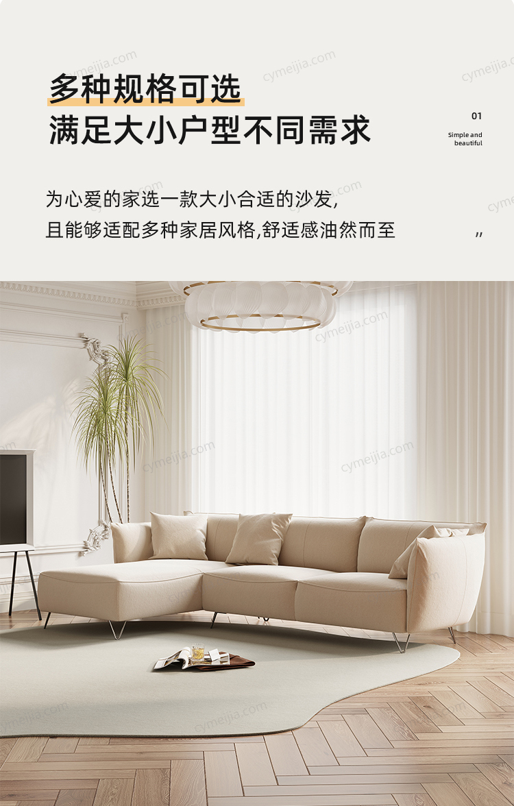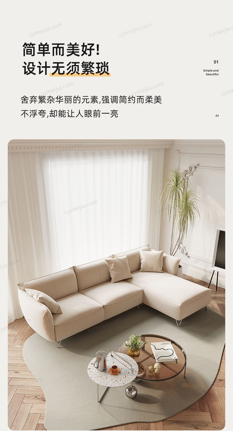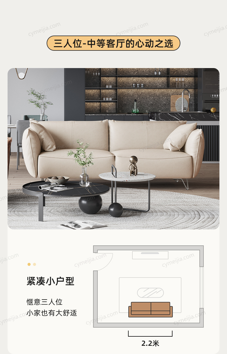 | 产品材质 : | 科技布+高回弹海绵+俄罗斯落叶松实木框架+玫瑰桉+铁艺脚 |