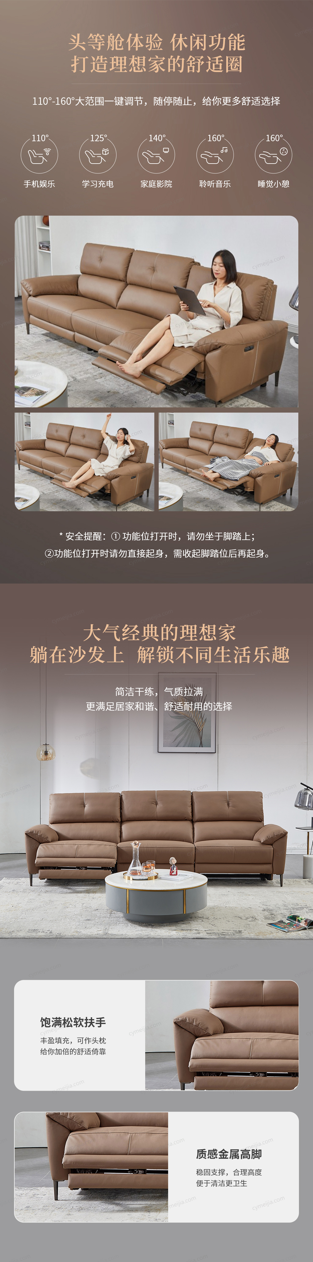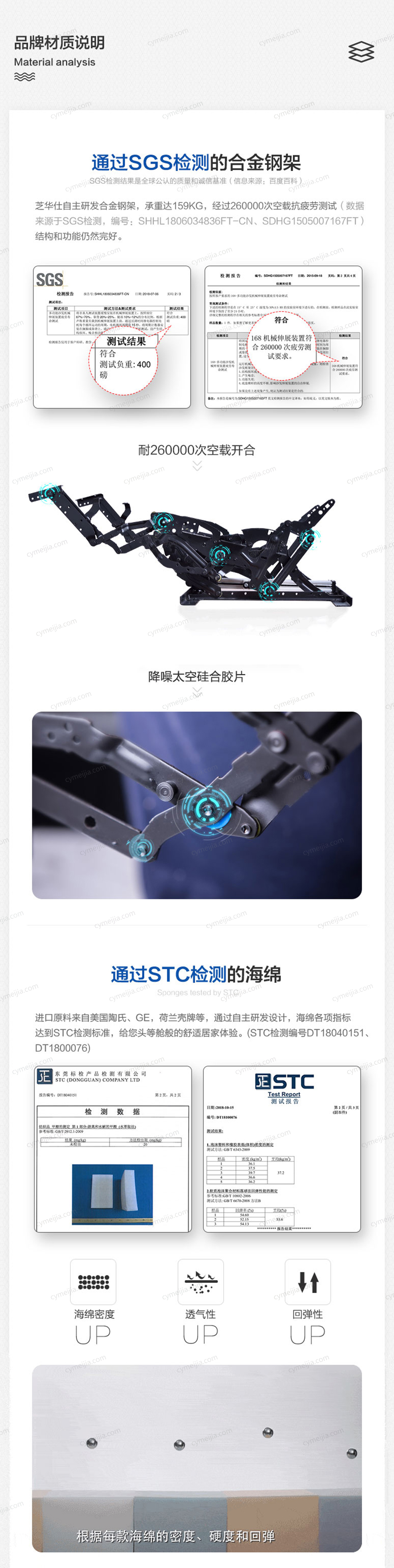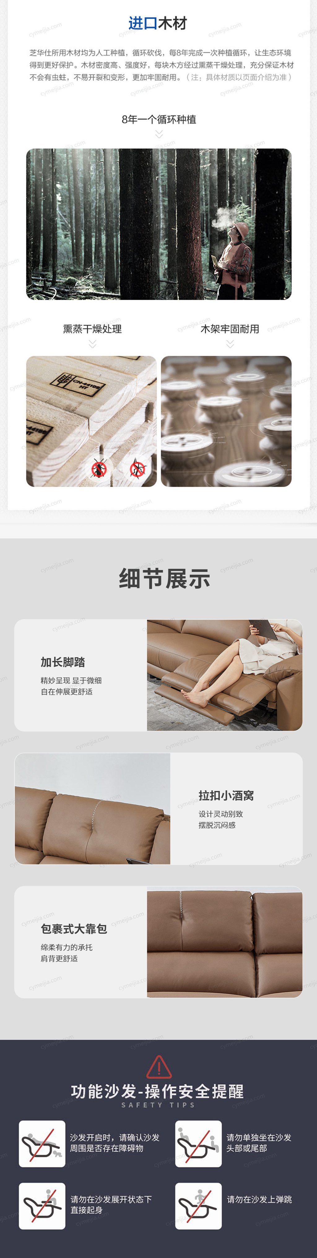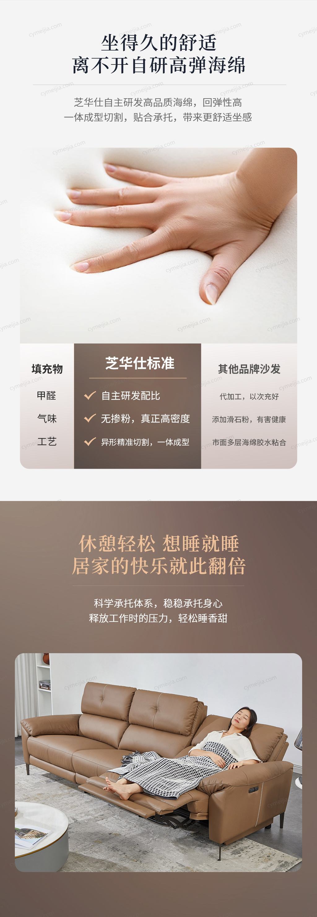 | 产品材质 : | 接触面进口头层黄牛皮+高回弹海绵+合金钢架+进口实木+多层实木板 |