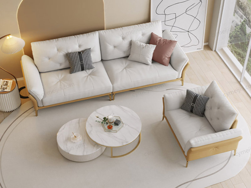 | 产品材质 : | 科技布+羽绒座包/靠包+高密度海绵+俄罗斯落叶松实木框架+不锈钢渡金脚 |