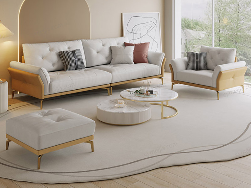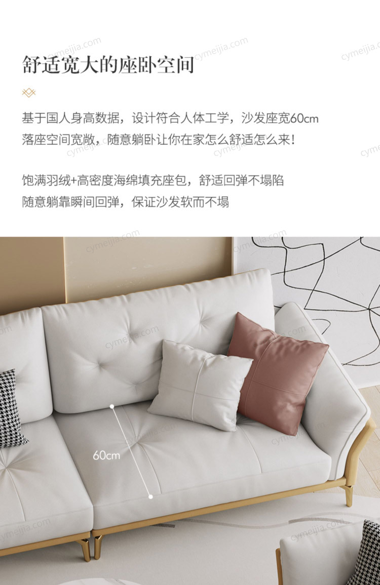 | 产品材质 : | 接触面进口头层黄牛皮+羽绒座包/靠包+高密度海绵+俄罗斯落叶松实木框架+不锈钢渡金脚 |