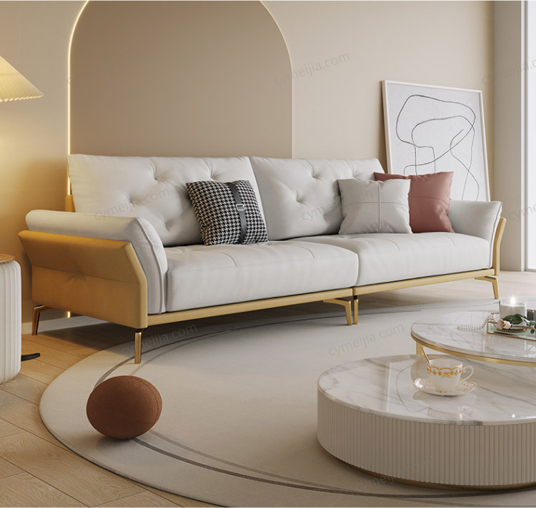 | 产品材质 : | 接触面进口头层黄牛皮+羽绒座包/靠包+高密度海绵+俄罗斯落叶松实木框架+不锈钢渡金脚 |