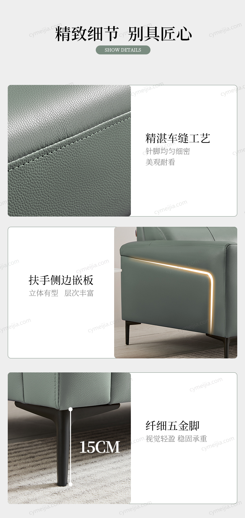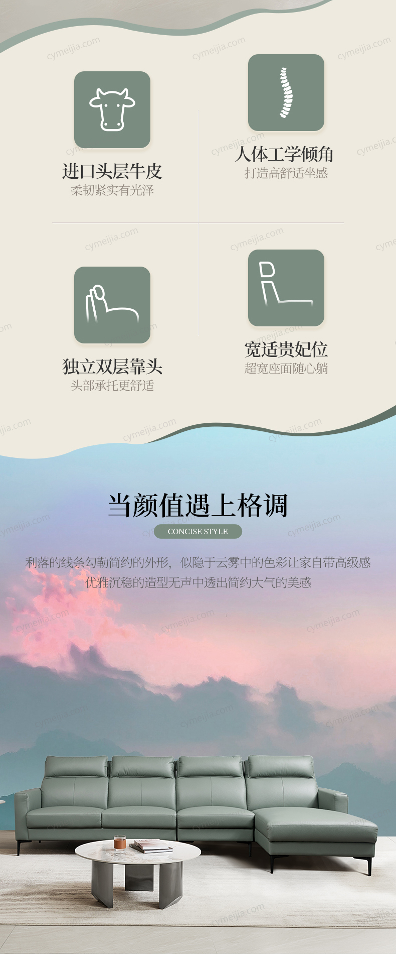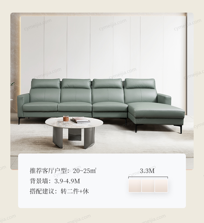| 产品材质 : 接触面进口头层黄牛皮+高密回弹海绵+丝绒+俄罗斯落叶松木框架+蛇形弹簧+金属脚 | 包件数 : 3 | 包装体积(m3) : 2.60 | |