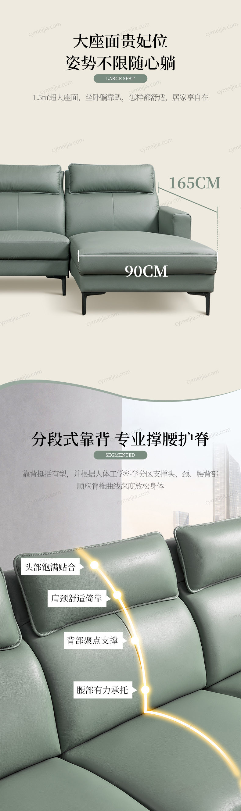 | 产品材质 : 接触面进口头层黄牛皮+高密回弹海绵+丝绒+俄罗斯落叶松木框架+蛇形弹簧+金属脚 | 包件数 : 3 | 包装体积(m3) : 2.90 | |