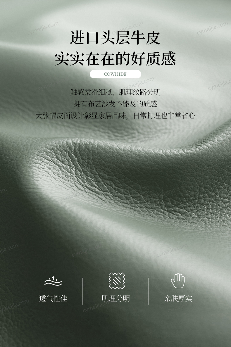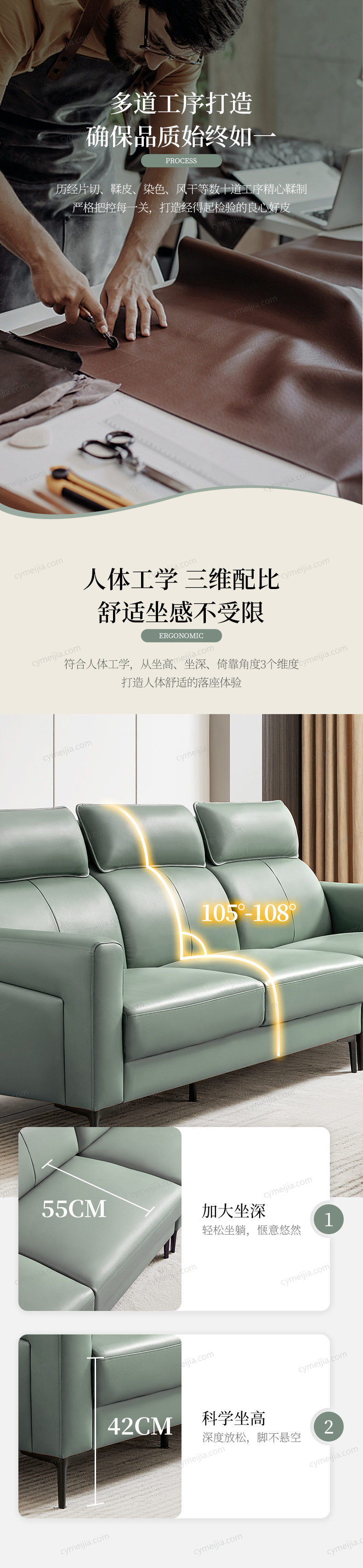 | 产品材质 : 接触面进口头层黄牛皮+高密回弹海绵+丝绒+俄罗斯落叶松木框架+蛇形弹簧+金属脚 | 包件数 : 2 | 包装体积(m3) : 2.04 | |