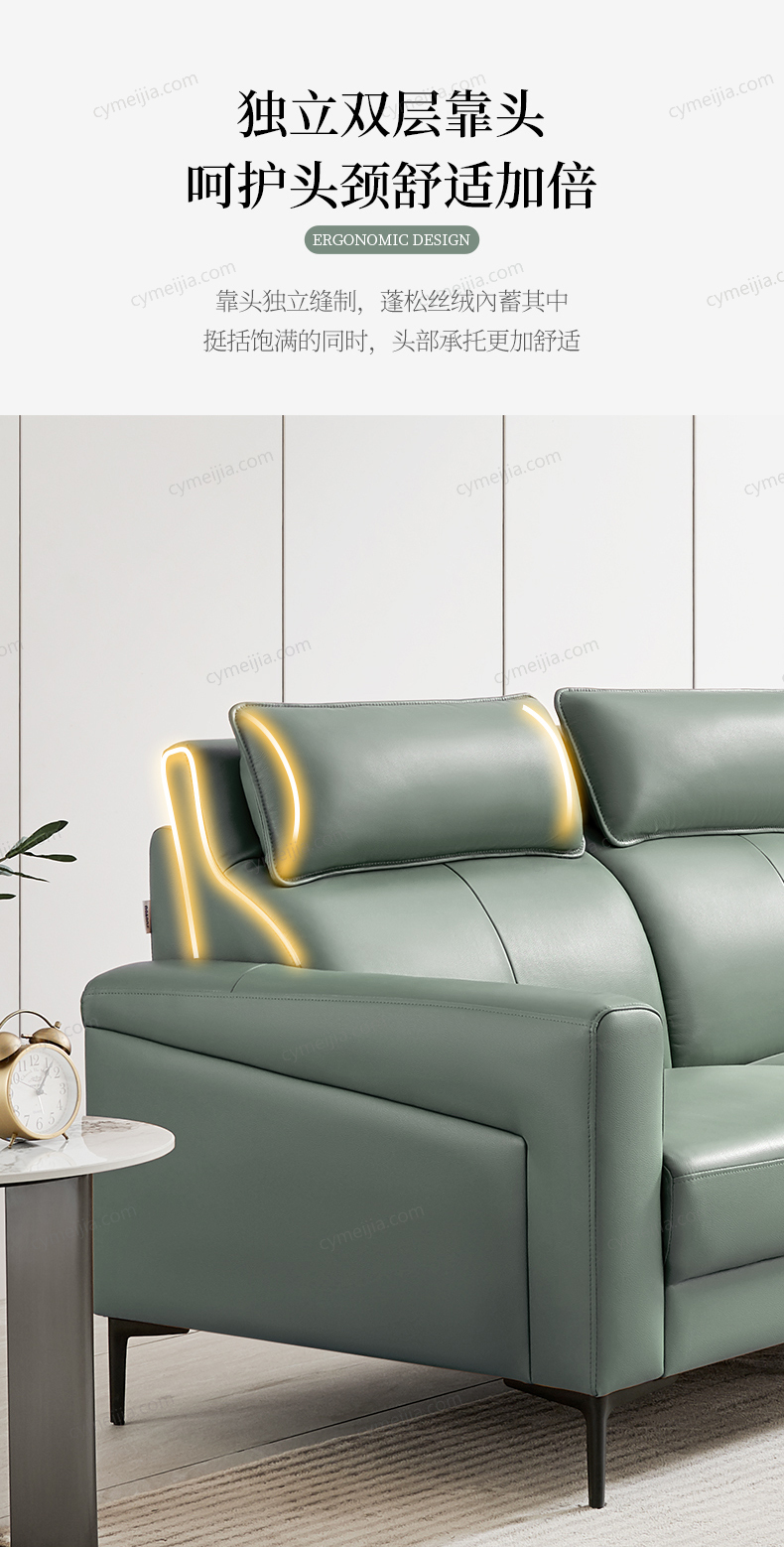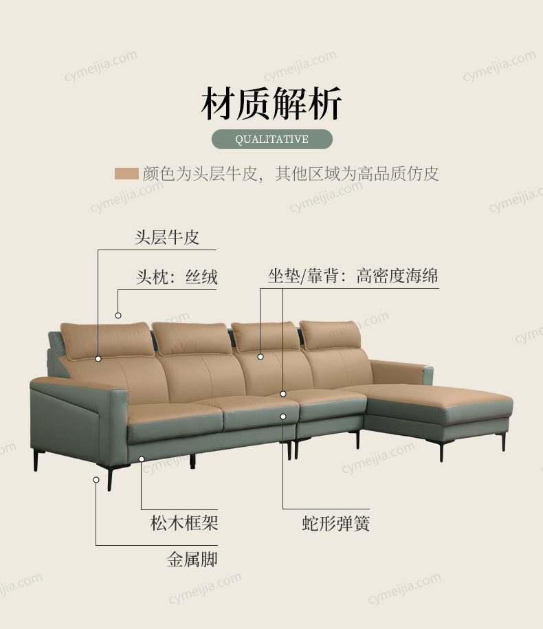 | 产品材质 : | 接触面进口头层黄牛皮+高密回弹海绵+丝绒+俄罗斯落叶松木框架+蛇形弹簧+金属脚 |