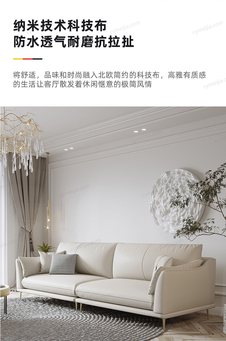 | 产品材质 : | 科技布+羽绒+高密度海绵+俄罗斯落叶松实木框架+玫瑰桉+五金脚 |