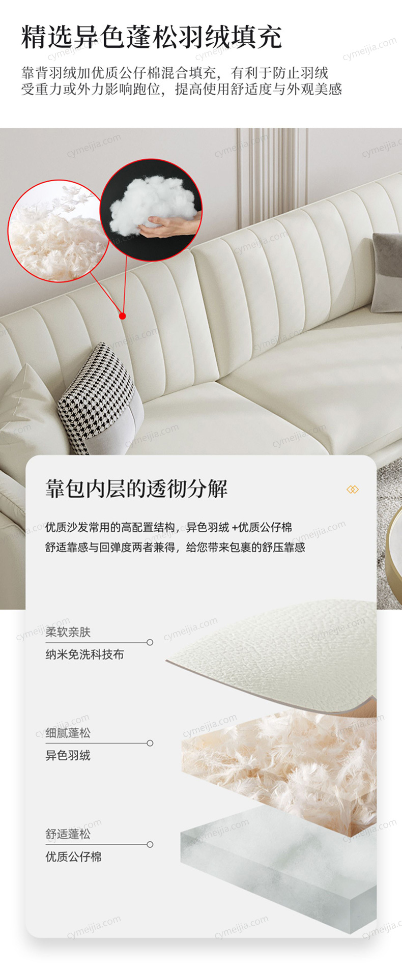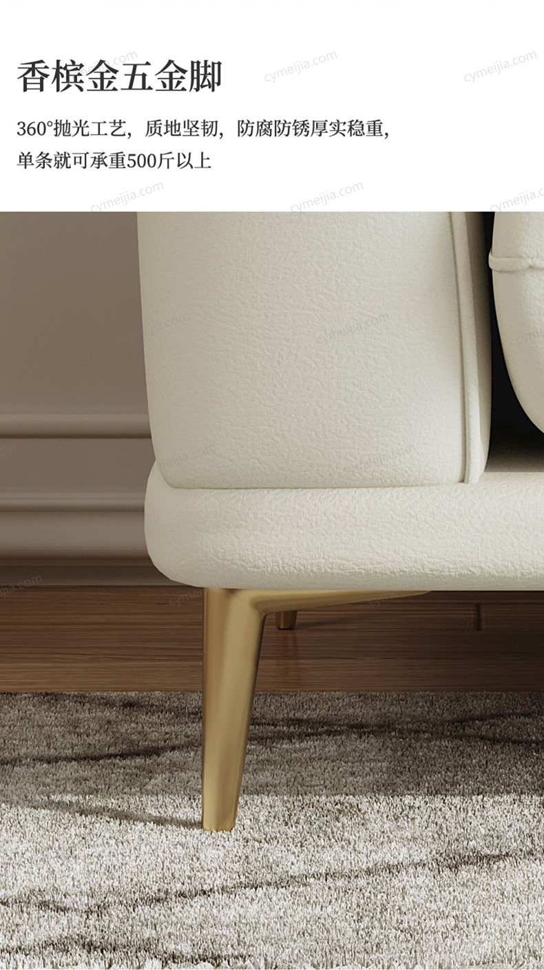 | 产品材质 : | 科技布+高密度海绵+俄罗斯落叶松实木框架+玫瑰桉+五金脚 |