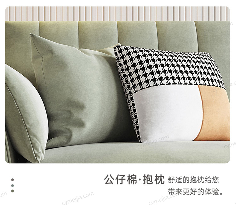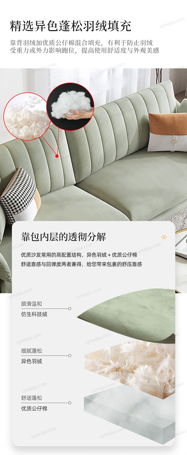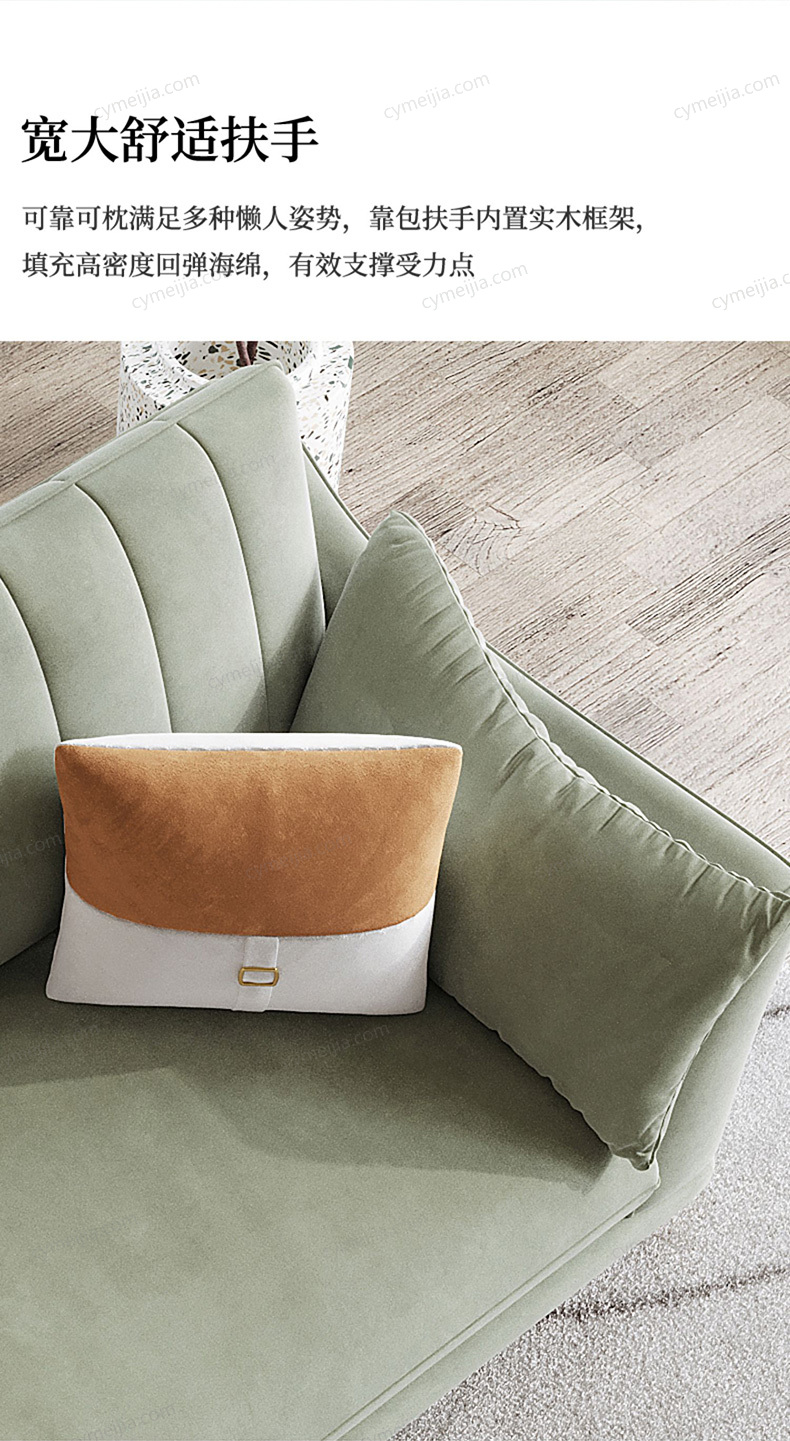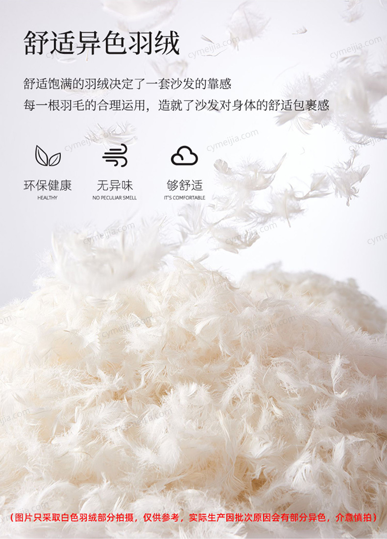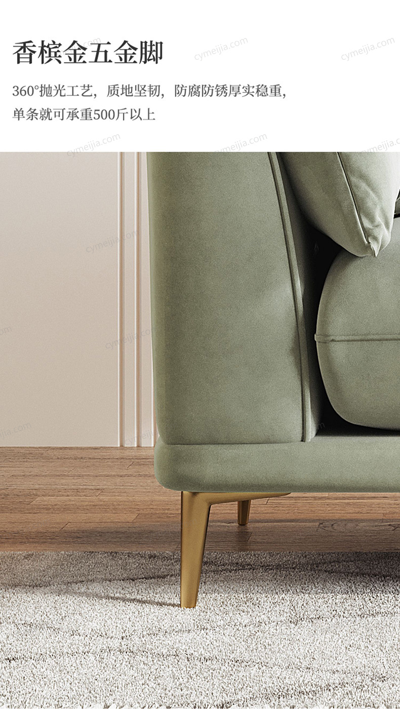 | 产品材质 : | 磨砂布+羽绒+高密度海绵+俄罗斯落叶松实木框架+玫瑰桉+五金脚 |