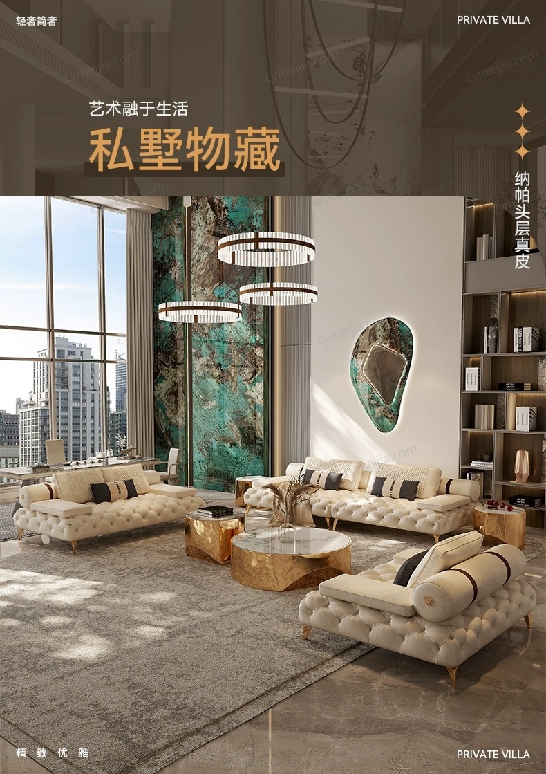 | 产品材质 : 头层真皮+全实木框架+高回弹海绵+镀金五金脚 | 包装体积(m3) : 4.08 | 产地 : 佛山 | |