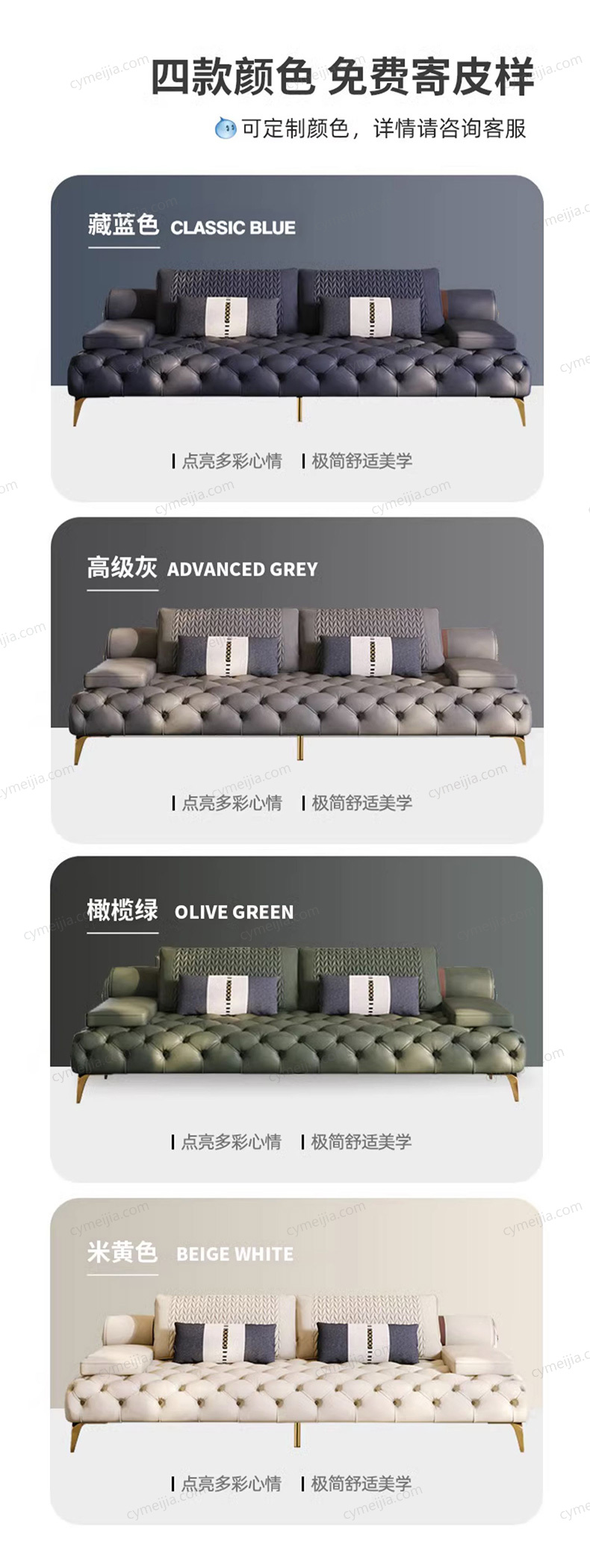 | 产品材质 : | 头层真皮+全实木框架+高回弹海绵+镀金五金脚 |