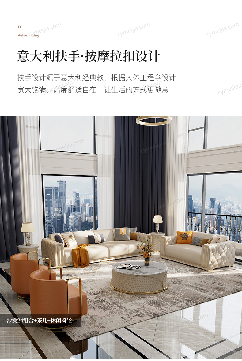 | 产品材质 : 接触面进口头层黄牛皮+高密度海绵+俄罗斯落叶松实木框架+不锈钢五金镀金 | 包件数 : 2 | 包装体积(m3) : 2.16 | |