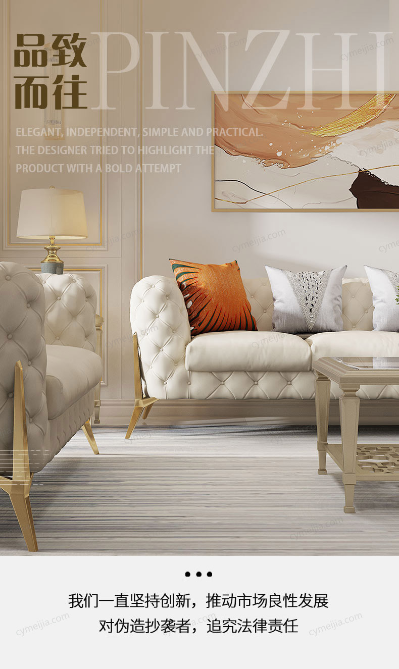 | 产品材质 : | 全真皮(进口头层黄牛皮)+高密度海绵+俄罗斯落叶松实木框架+不锈钢五金镀金 |