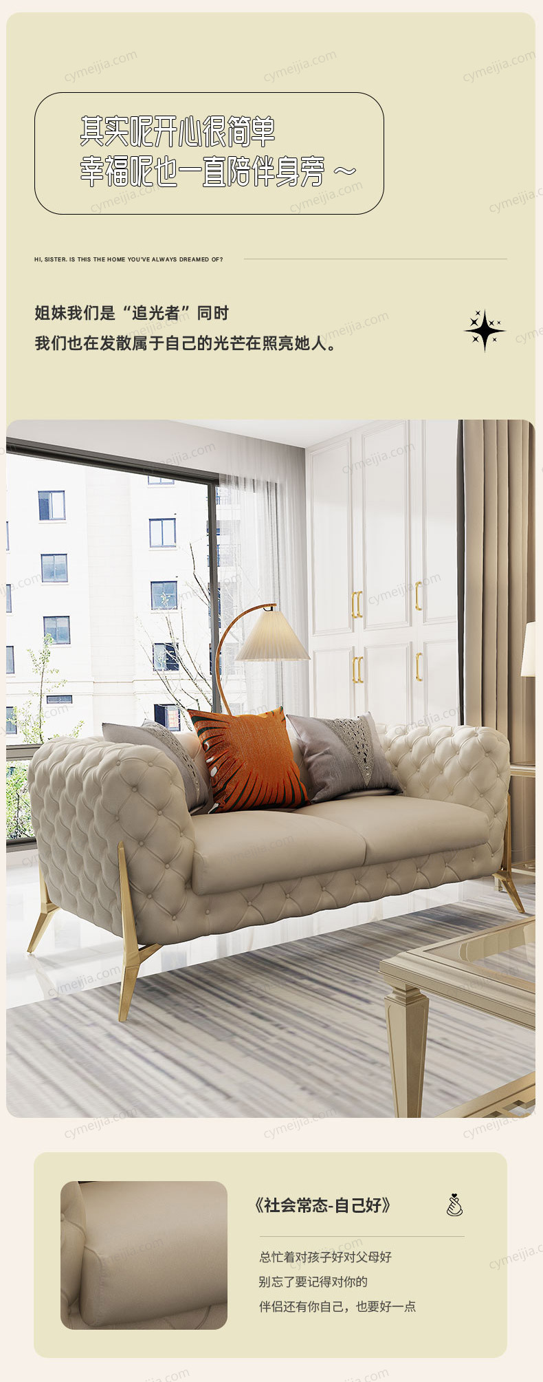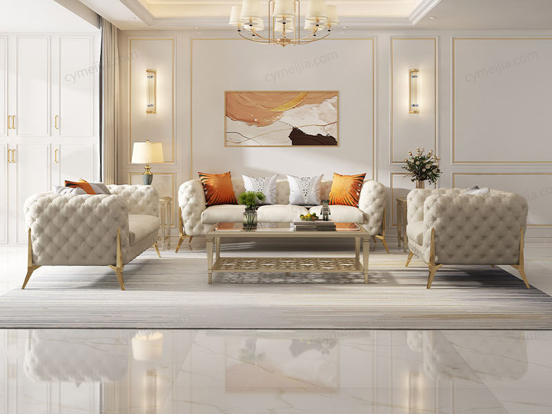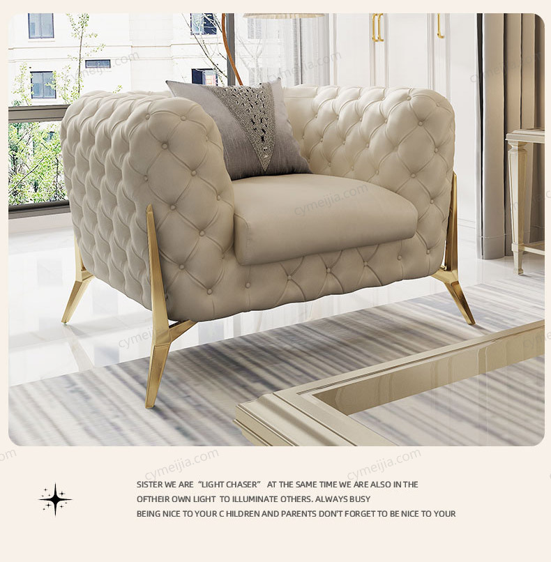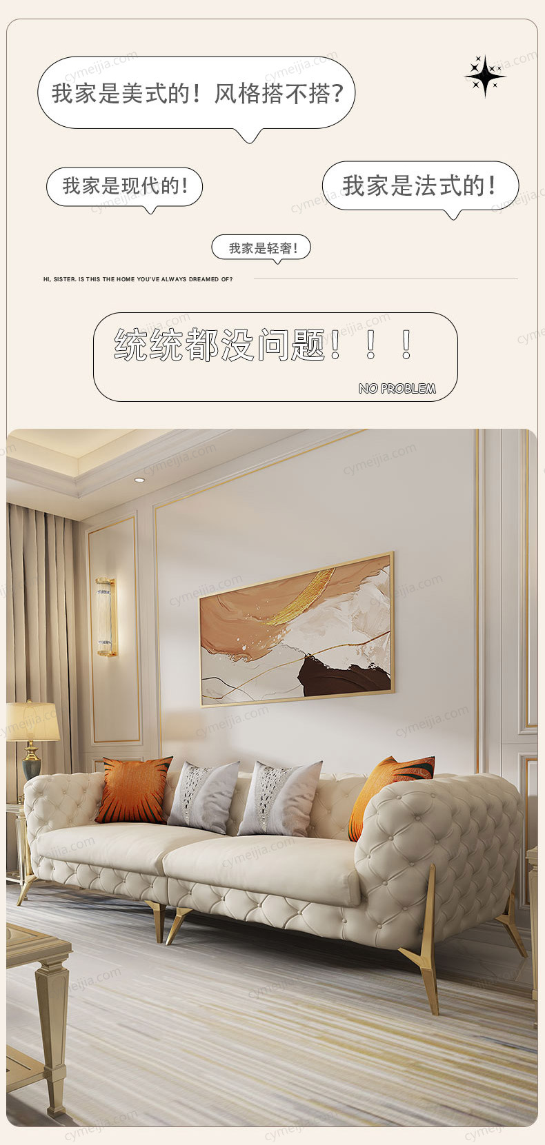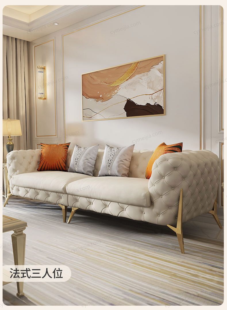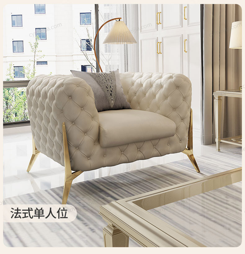 | 产品材质 : | 全真皮(进口头层黄牛皮)+高密度海绵+俄罗斯落叶松实木框架+不锈钢五金镀金 |