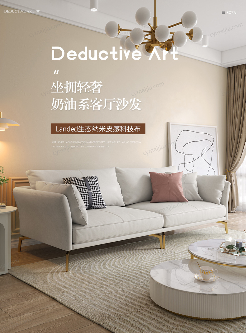 | 产品材质 : | 科技布+羽绒+高密度海绵+俄罗斯落叶松实木框架+五金镀金脚 |