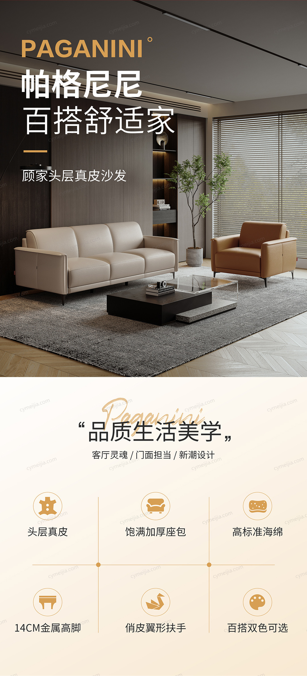| 产品材质 : | 接触面进口头层黄牛皮+实木框架+高回弹环保绵+14CM金属高脚 |