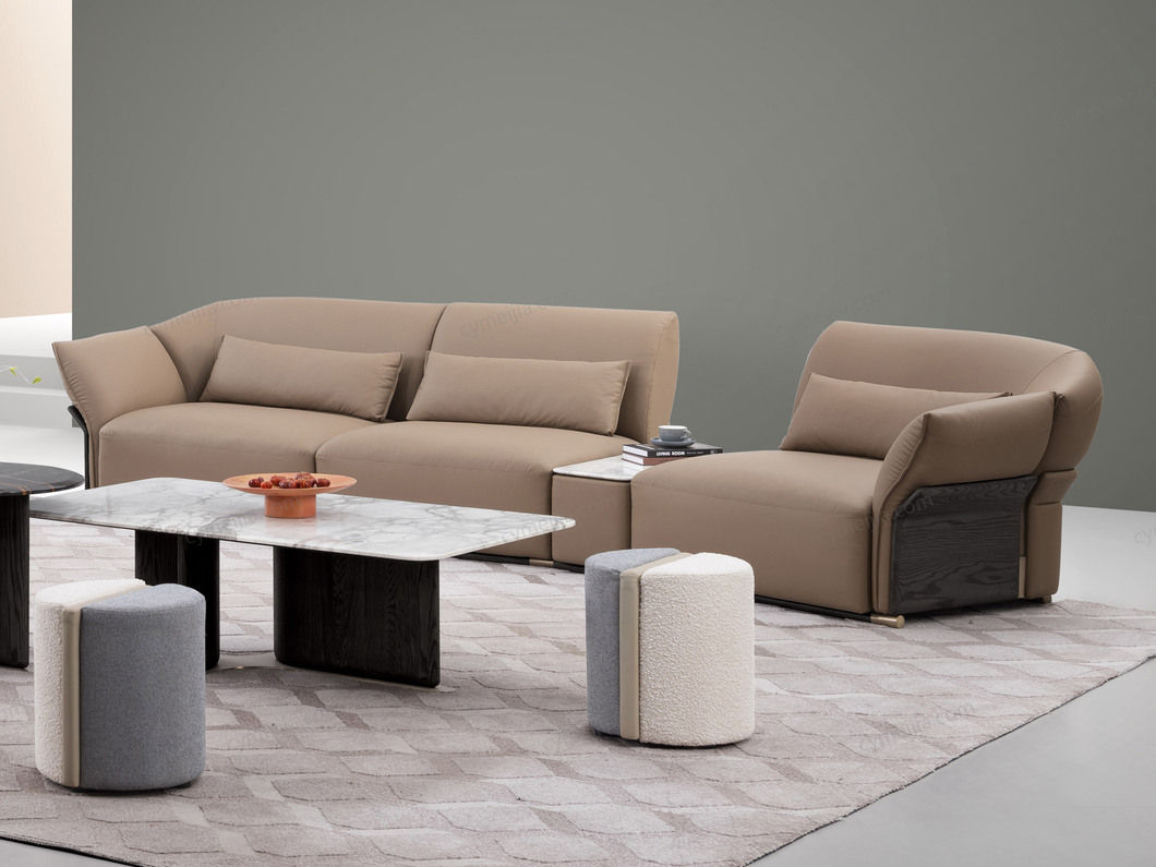 | 产品材质 : | 接触面进口头层黄牛皮+天然大理石+北美红橡木+新西兰无节落叶松木+羽绒靠包+不锈钢电镀拉丝 |