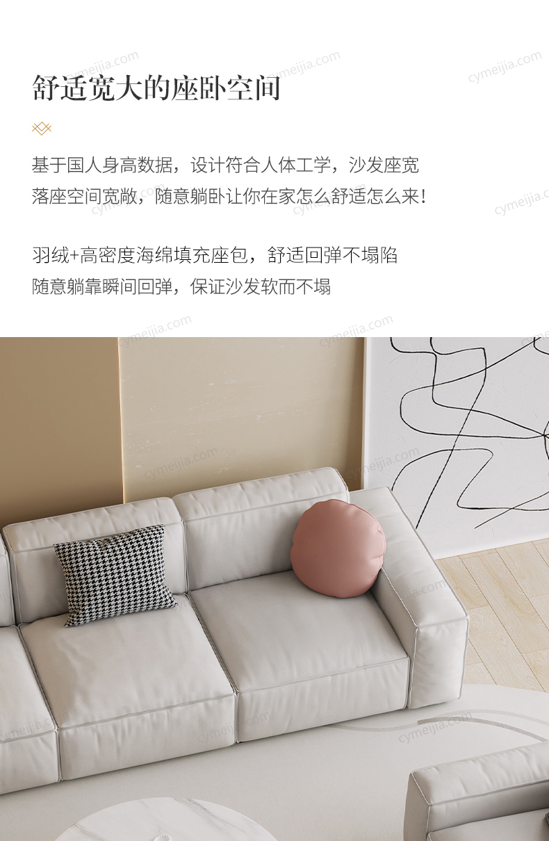 | 产品材质 : | 科技布+羽绒座包/抱枕+高密度海绵+俄罗斯落叶松实木框架+实木脚 |