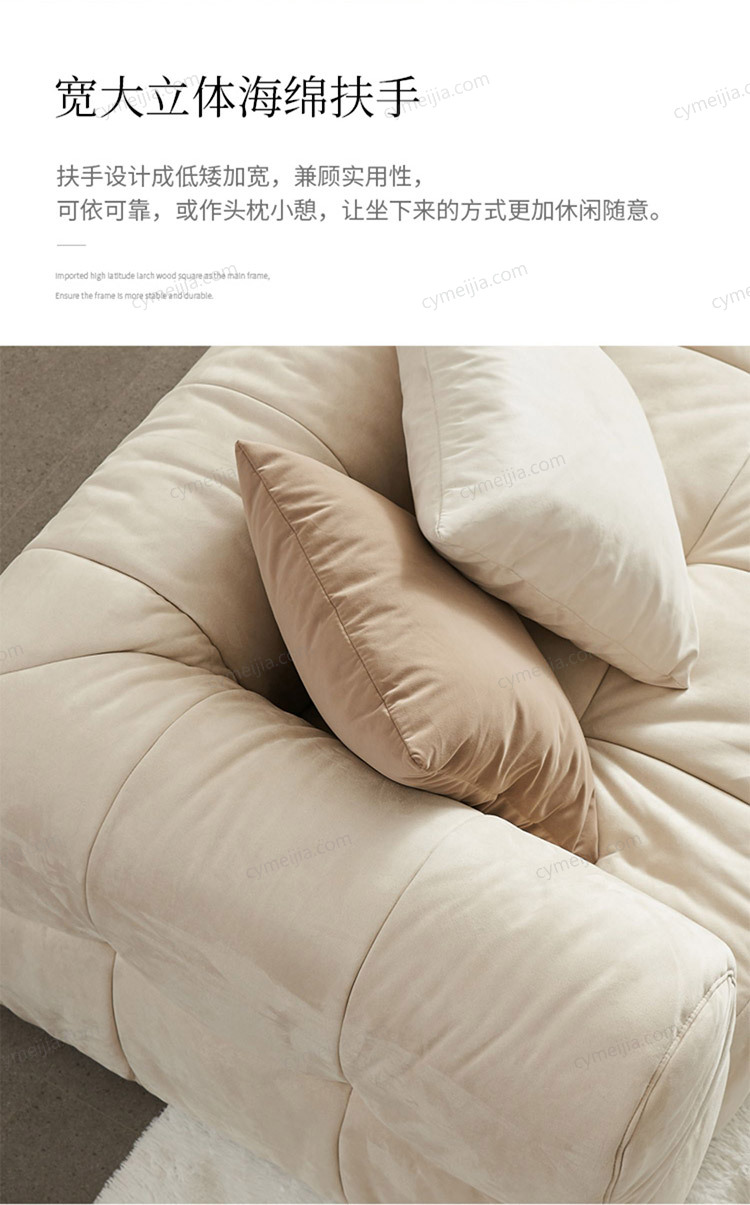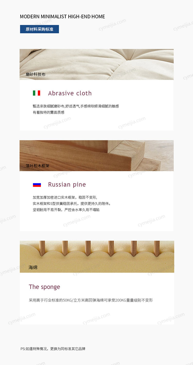 | 产品材质 : | 磨砂绒+高密度海绵+俄罗斯落叶松实木框架+实木脚 |