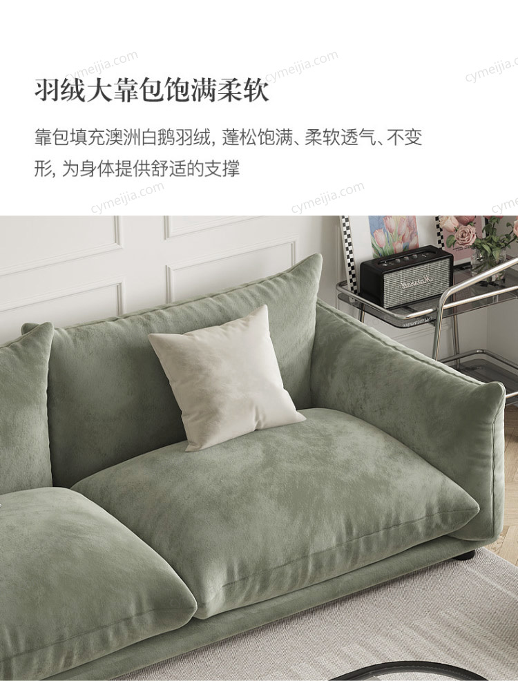 | 产品材质 : | 绒布+羽绒+高密度海绵+俄罗斯落叶松实木框架 |