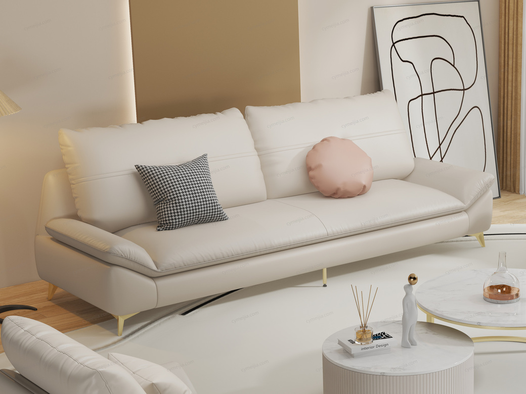 | 产品材质 : | 仿真皮+羽绒靠包+高密度海绵+四面刨光桉木方加松木方+进口4.0蛇形弹簧+加宽橡筋 |