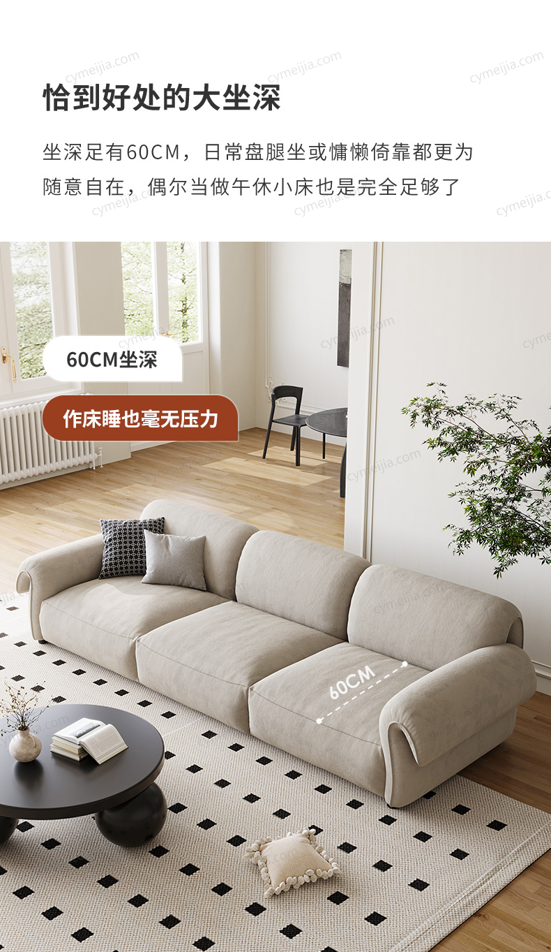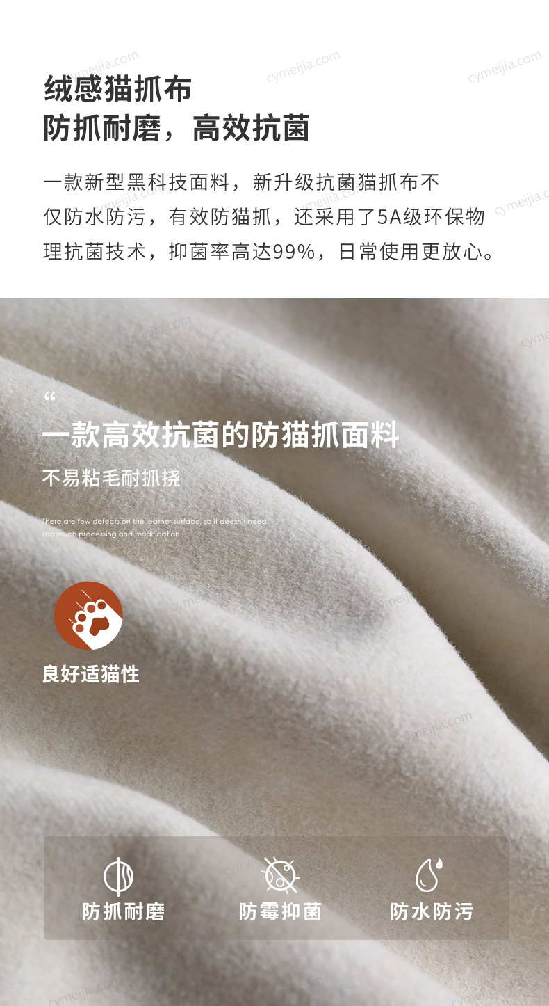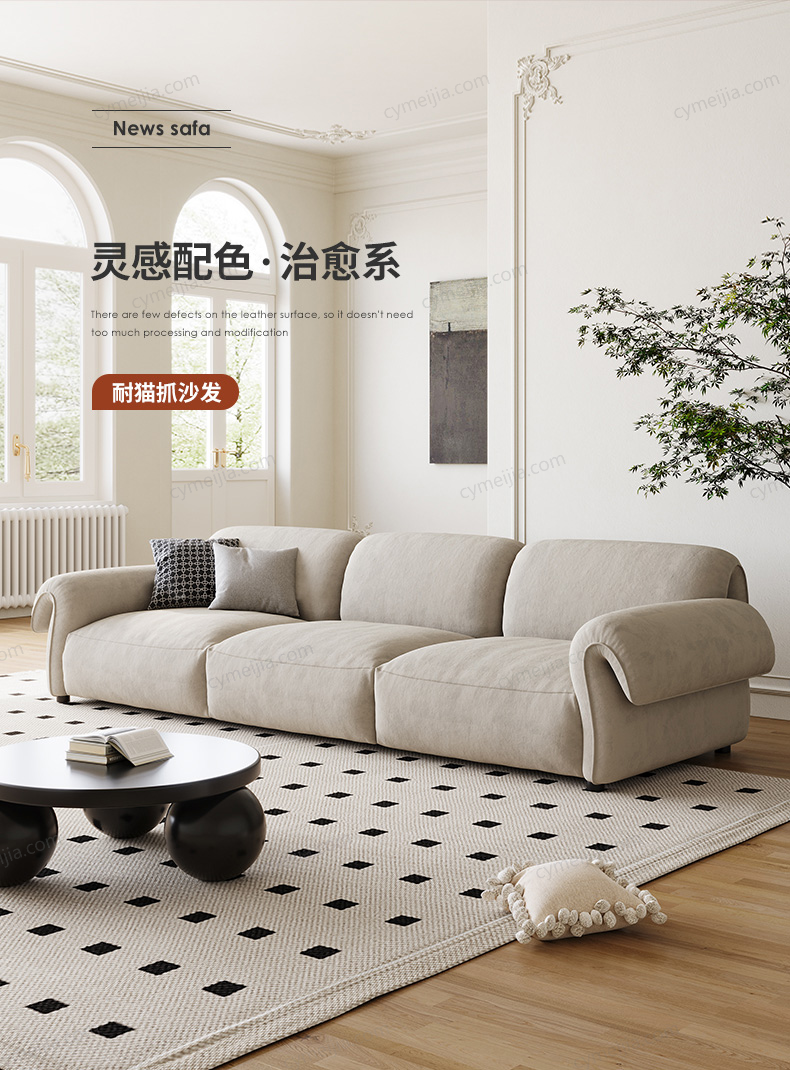 | 产品材质 : | 猫抓绒+羽绒座包+优质紫罗兰高密度海绵+俄罗斯落叶松实木框架+实木脚 |
