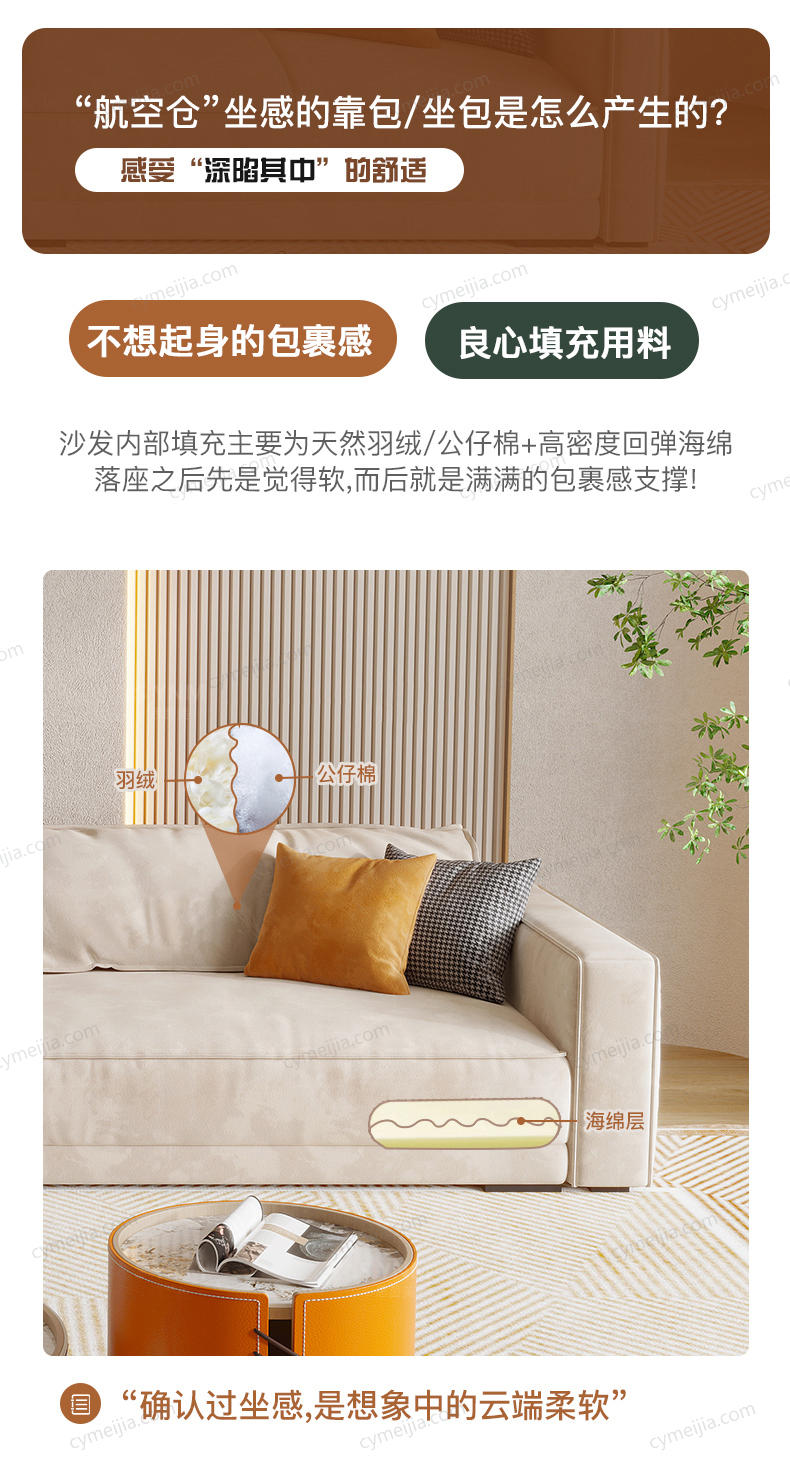 | 产品材质 : | 麂皮绒+羽绒座包/靠包+高密度海绵+俄罗斯落叶松实木框架 |
