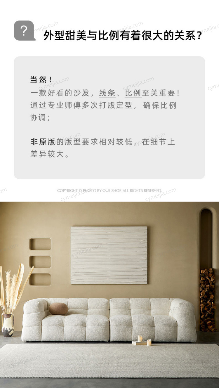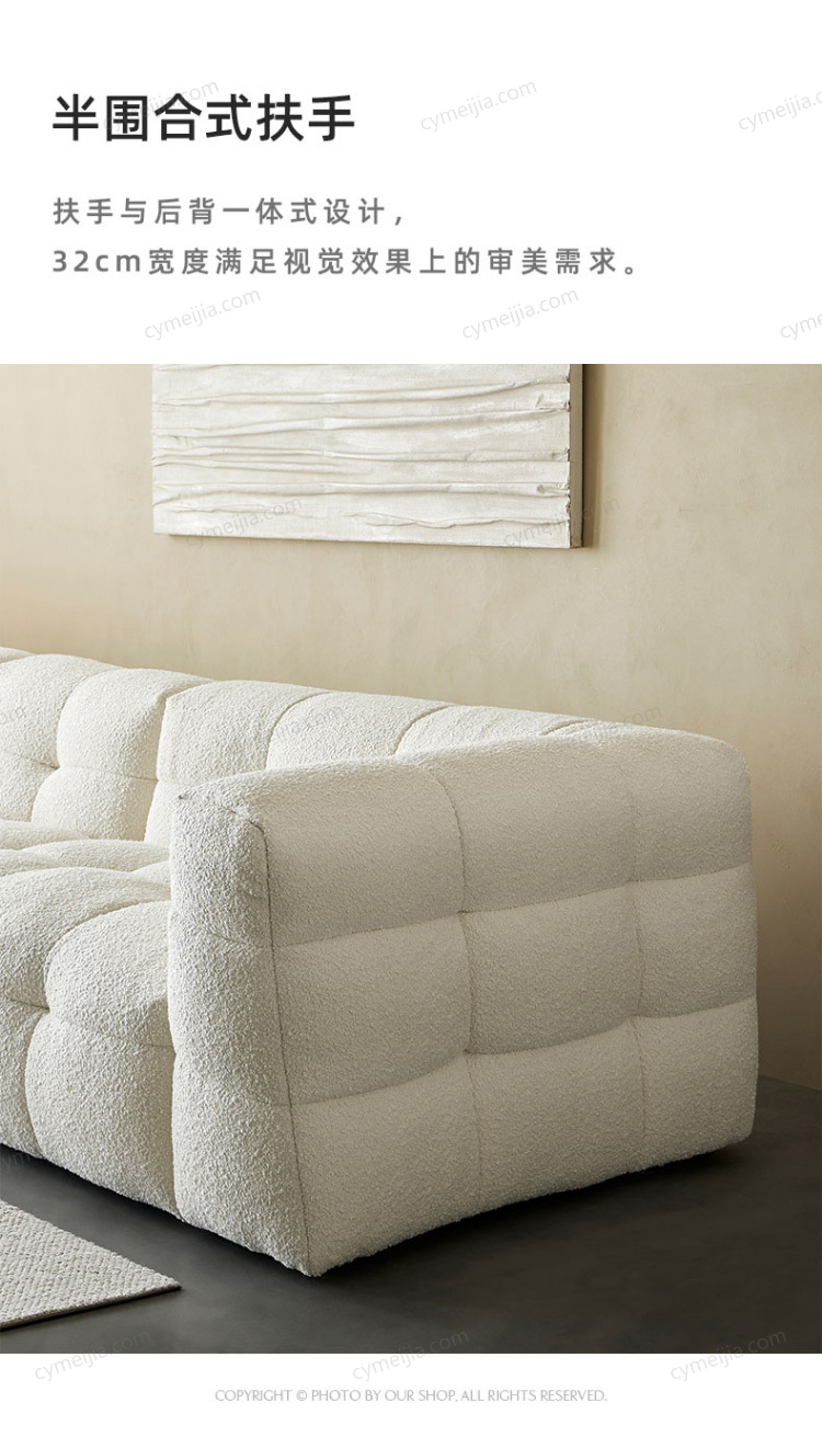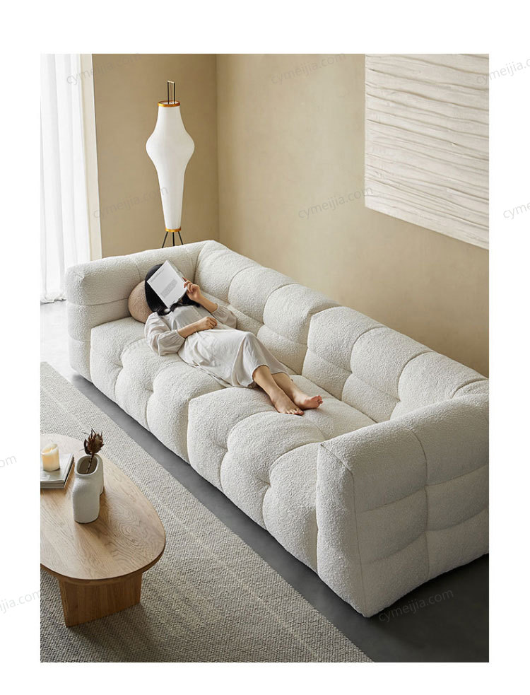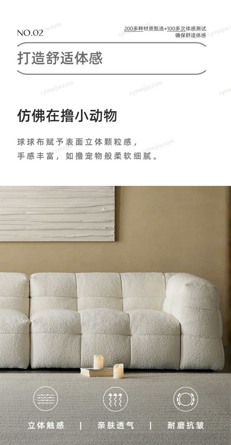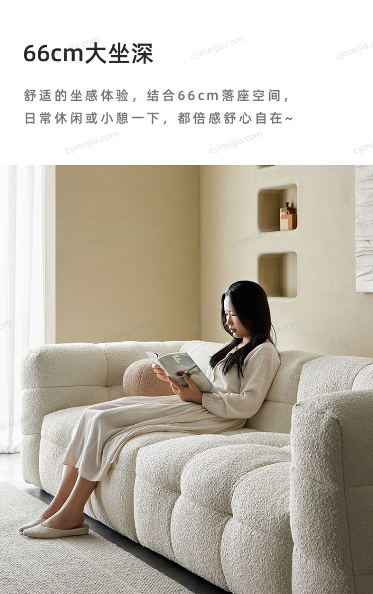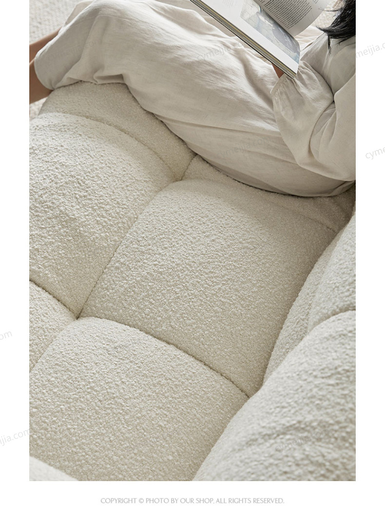 | 产品材质 : | 羊羔绒+高密度海绵+俄罗斯落叶松实木框架+玫瑰桉+五金脚 |