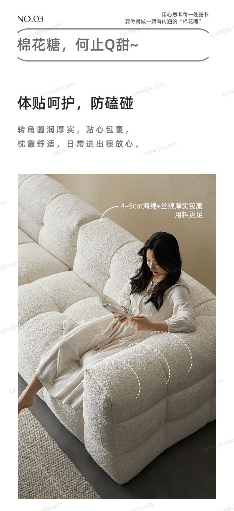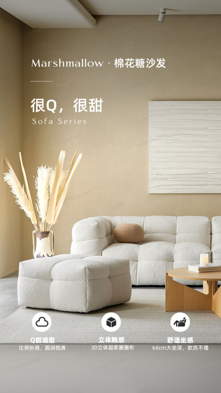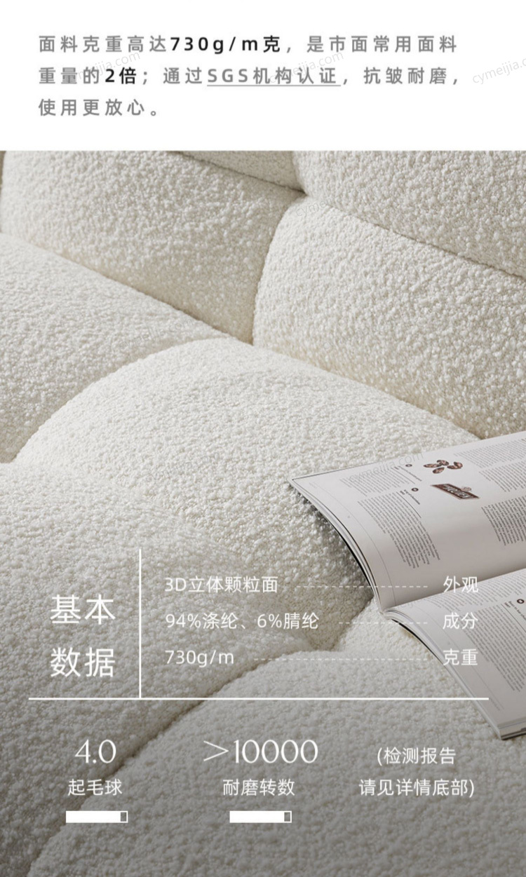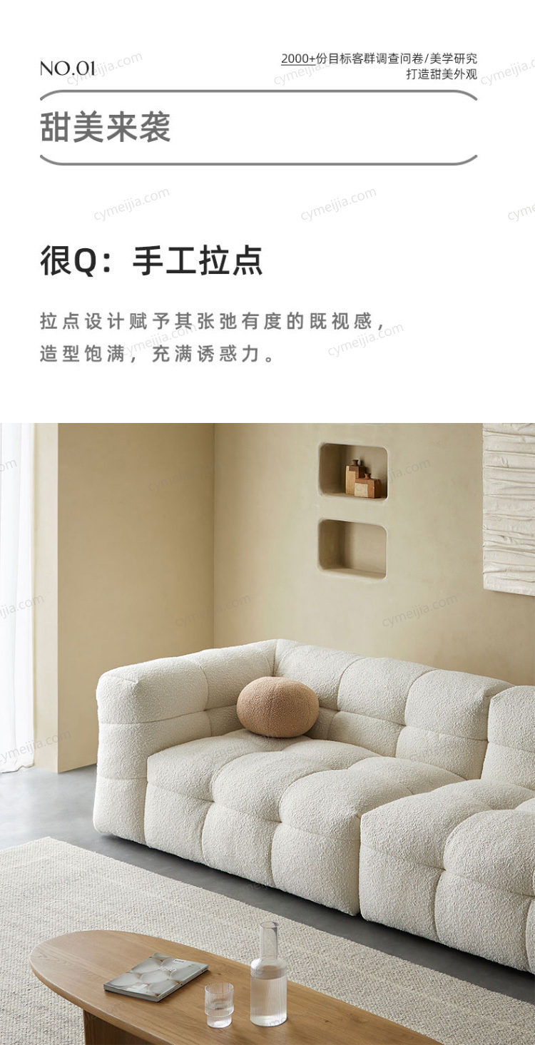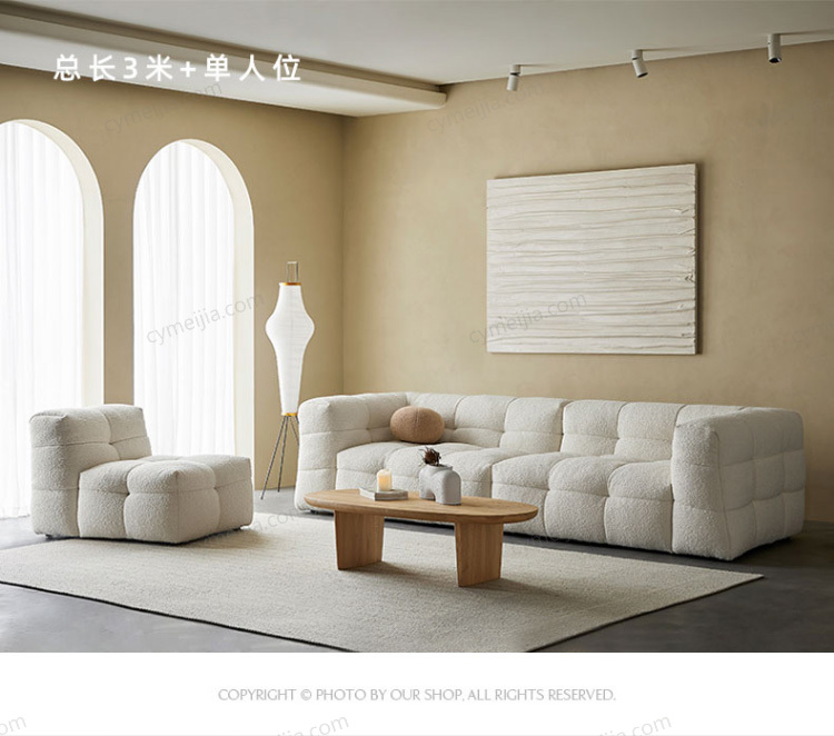 | 产品材质 : | 羊羔绒+高密度海绵+俄罗斯落叶松实木框架+玫瑰桉+五金脚 |