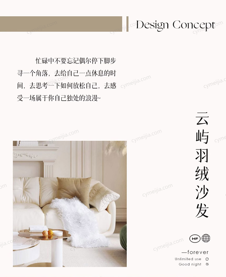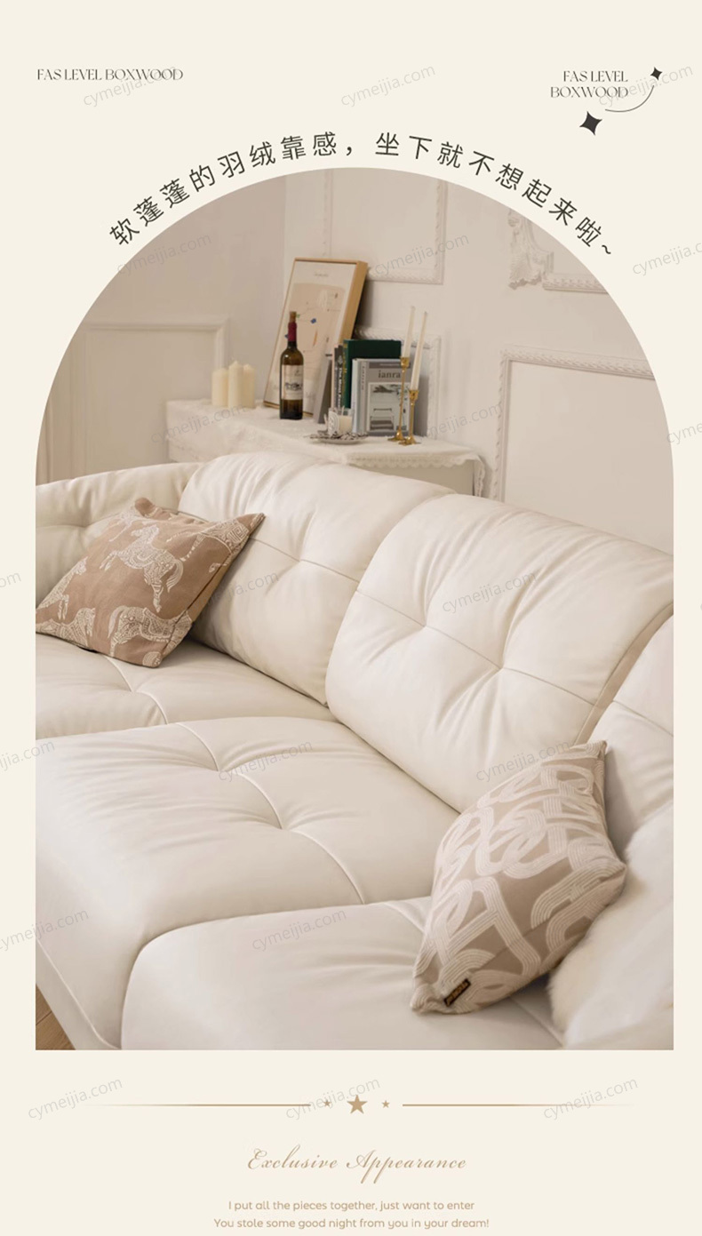 | 产品材质 : | 科技布+羽绒内芯+45D高密度海绵+俄罗斯落叶松实木框架+玫瑰桉+5公分实木脚 |