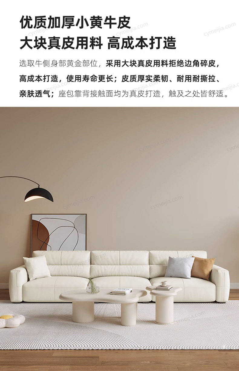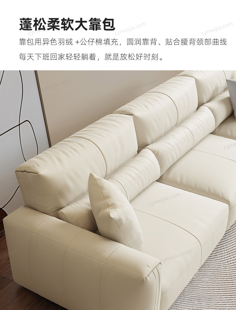 | 产品材质 : | 接触面进口头层黄牛皮+羽绒+高密度海绵+俄罗斯落叶松实木框架+5分碳素钢圆脚 |