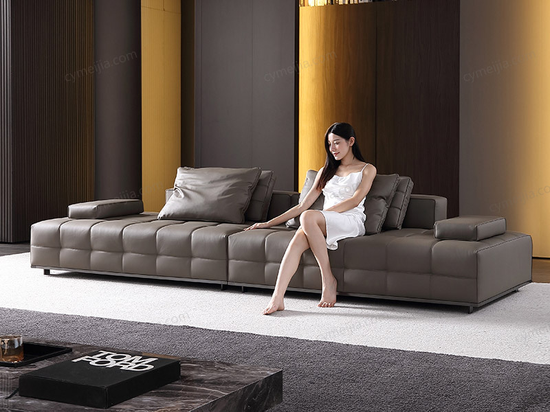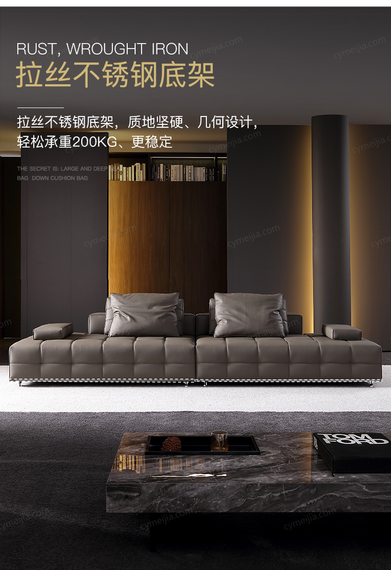 | 产品材质 : | 全真皮(进口头层黄牛皮)+羽绒靠包+高密度海绵+俄罗斯落叶松实木框架+拉丝不锈钢底架 |