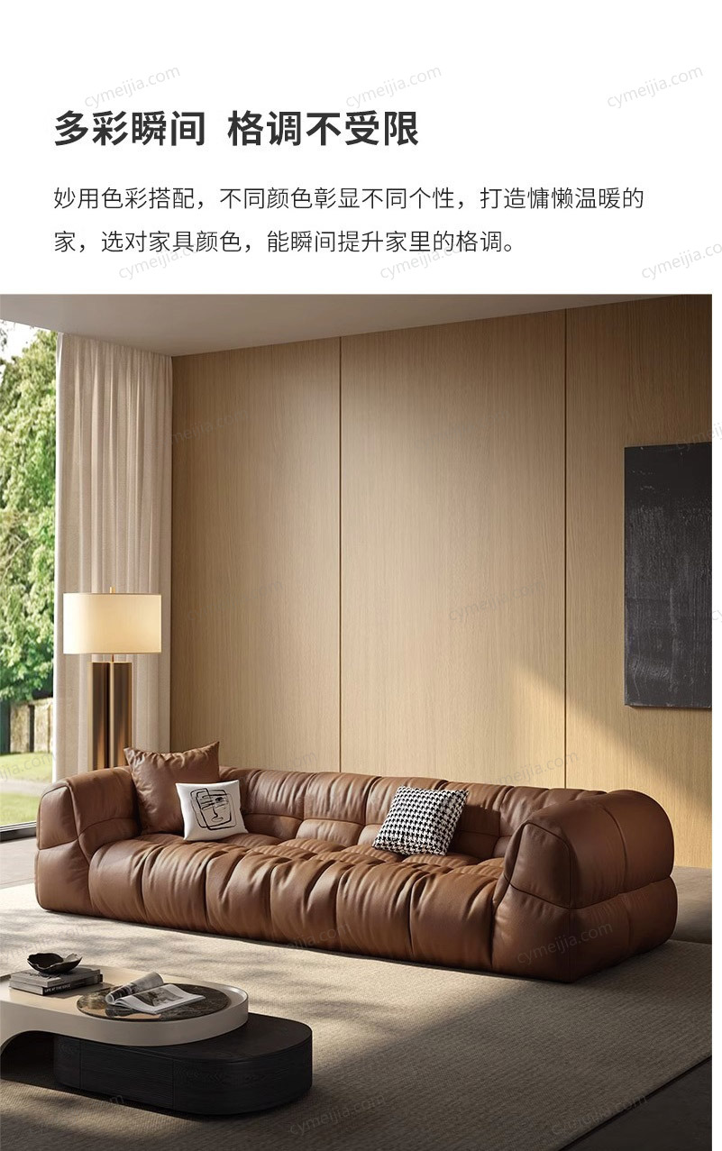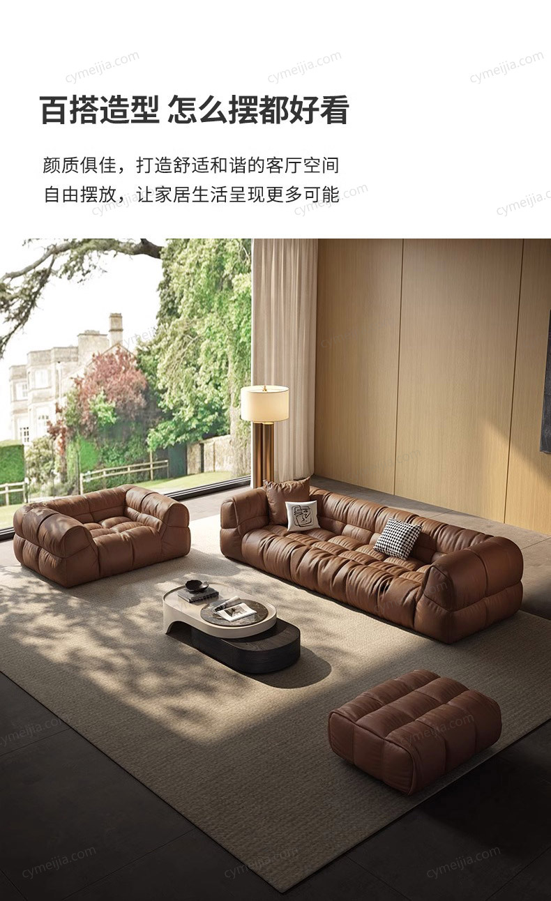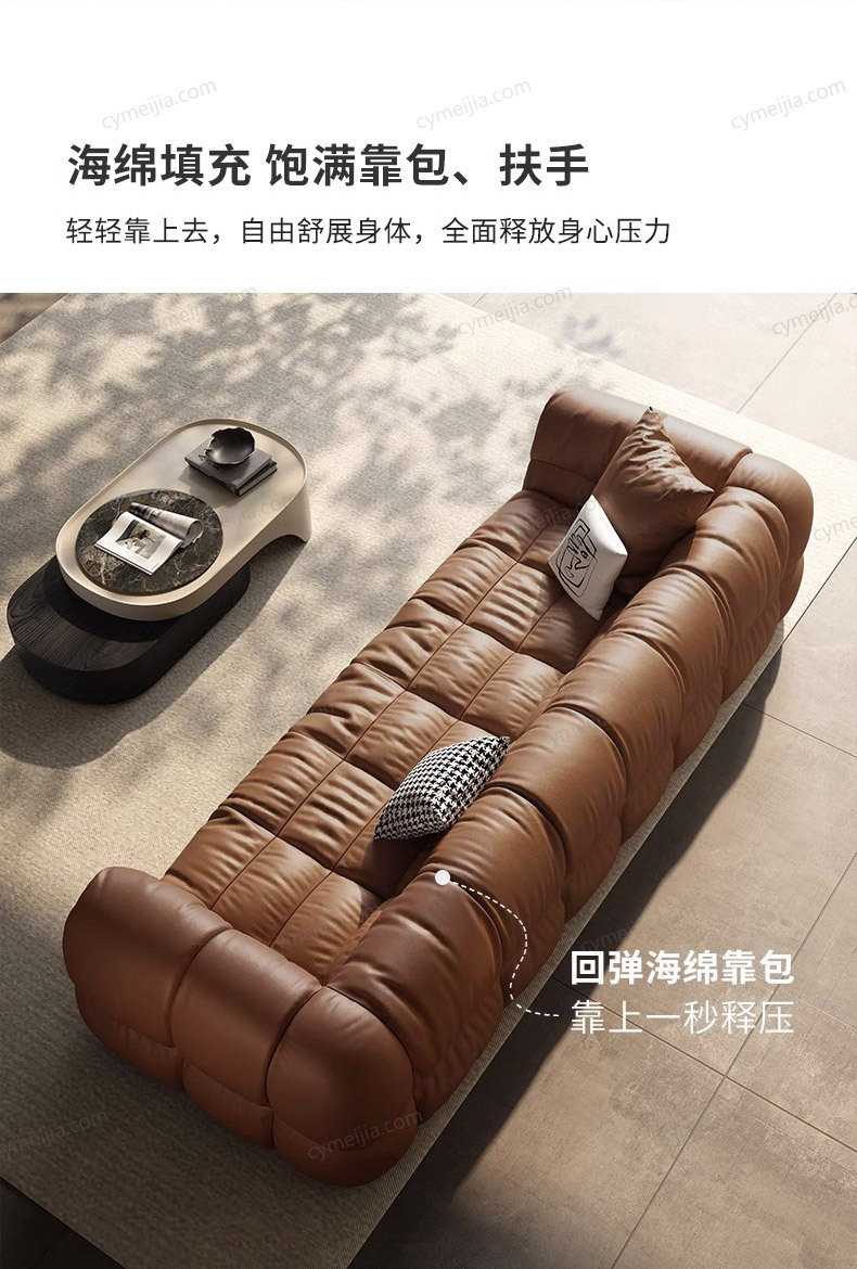 | 产品材质 : | 接触面进口头层黄牛皮+羽绒填充+高密度海绵+实木框架 |
